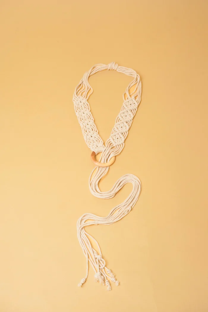 Macramé belt in bright white color featuring intricate knotted patterned design on one end and long free-hanging braided cords on the other with a wooden ring buckle in the center