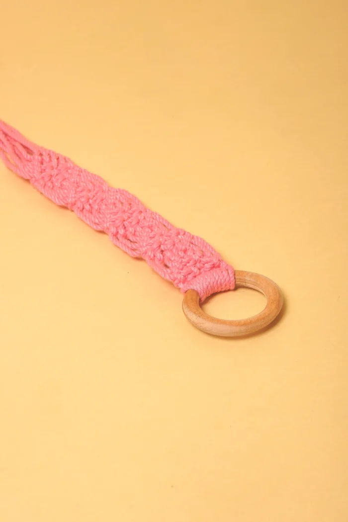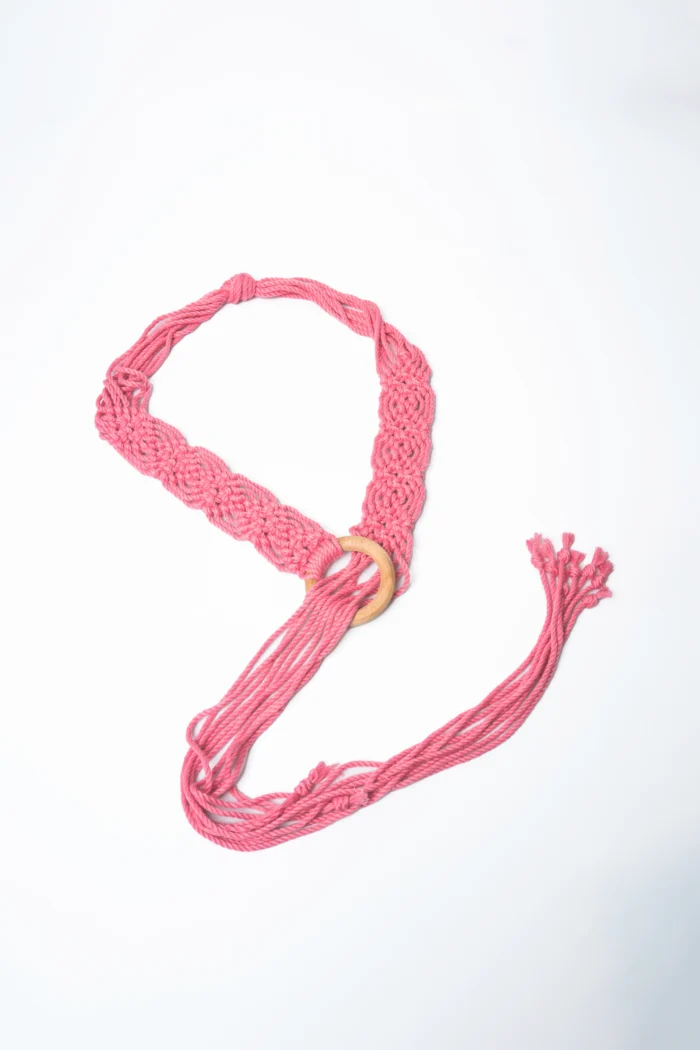 Macramé belt featuring intricate knotted patterned design on one end and long free-hanging braided cords on the other with a wooden ring buckle in the center