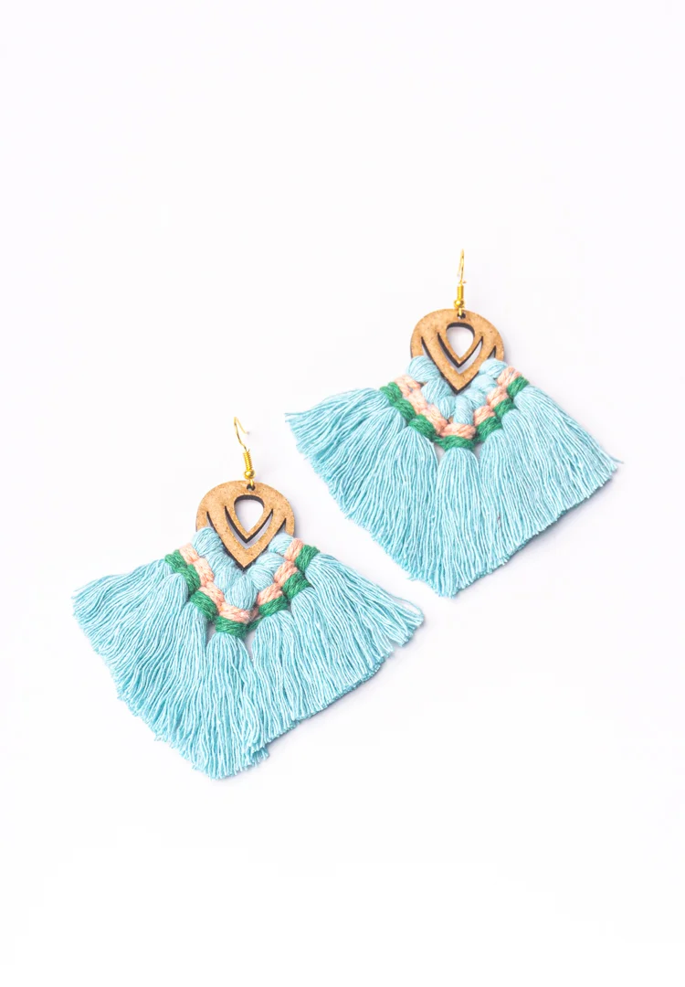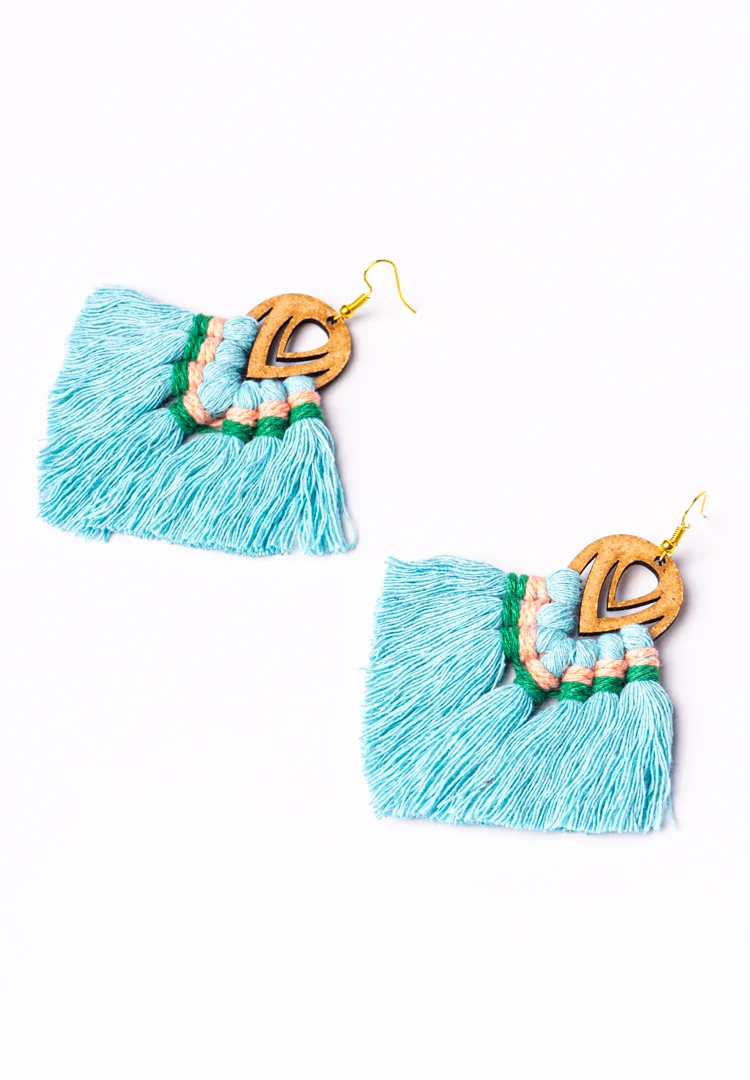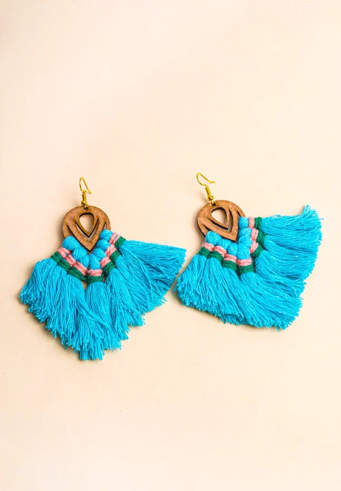 Macramé colourful tassel earrings crafted with soft cotton cords and a lightweight wood base. They give a bohemian elegance to your look exude a chic and rustic charm. These macrame tassel earrings add a unique touch to your jewellery collection.