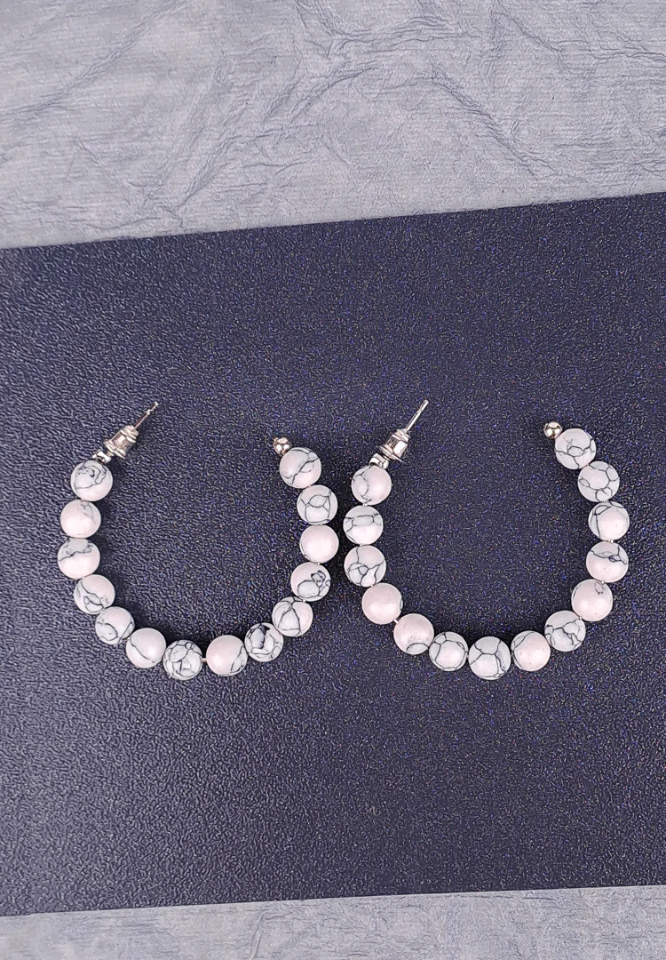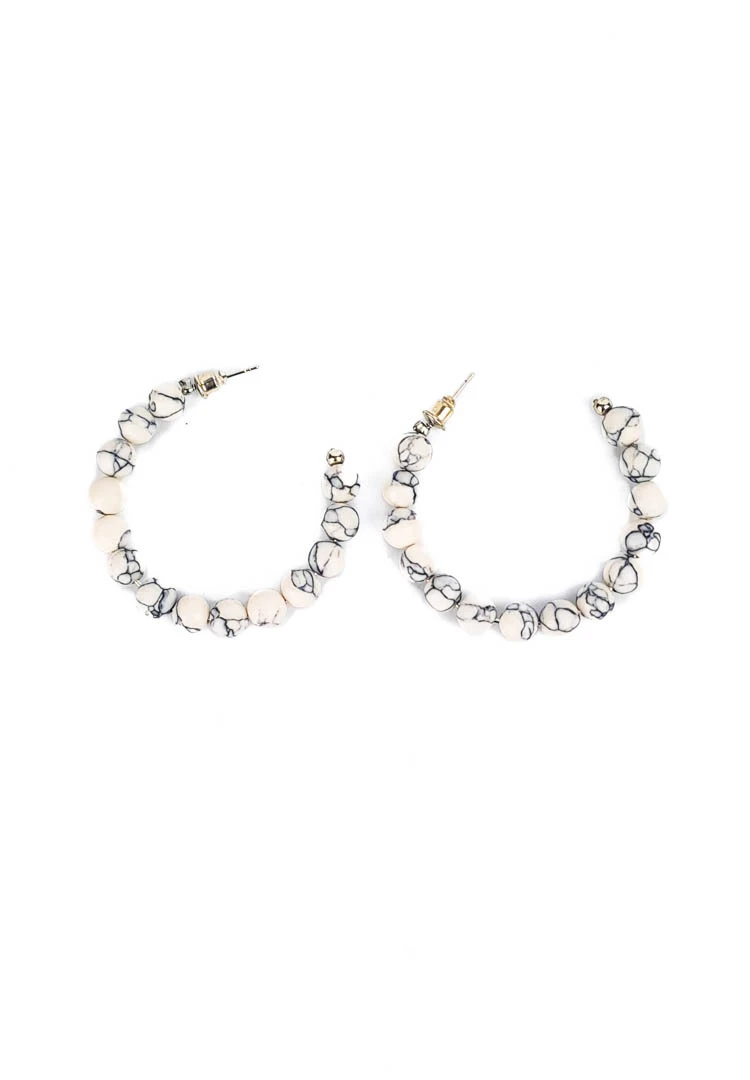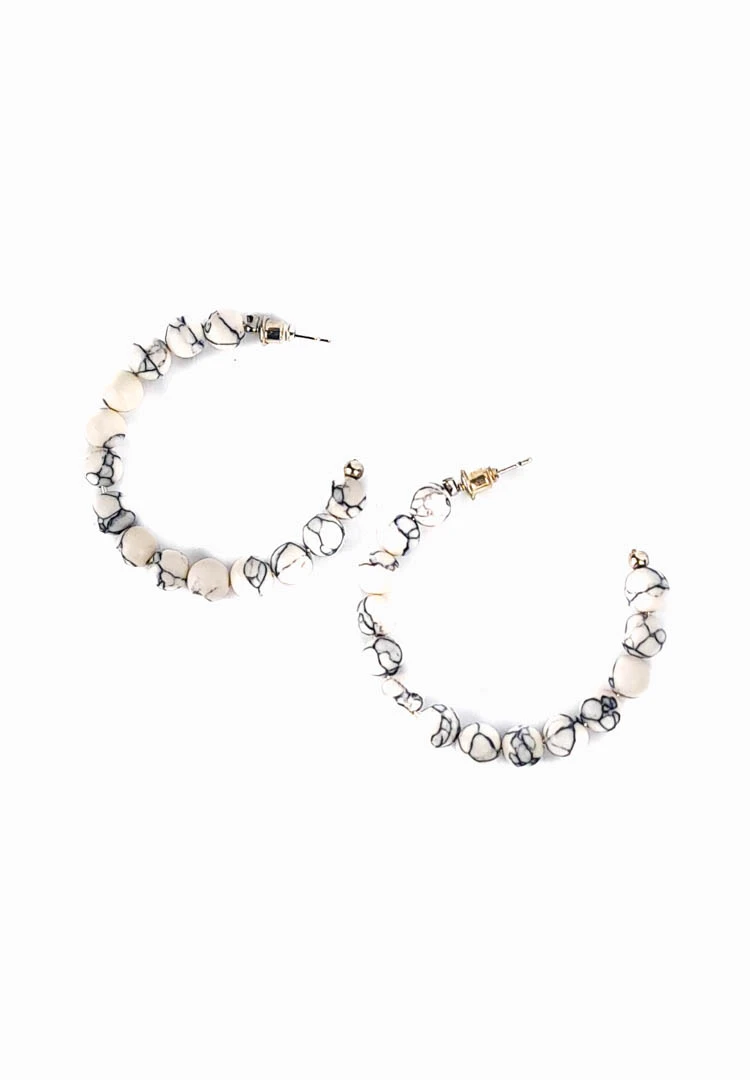 Large hoop earrings adorned with round white marble beads featuring subtle gray veining, set on a polished wire base. The design blends classic and contemporary aesthetics, secured with a comfortable latch-back closure.