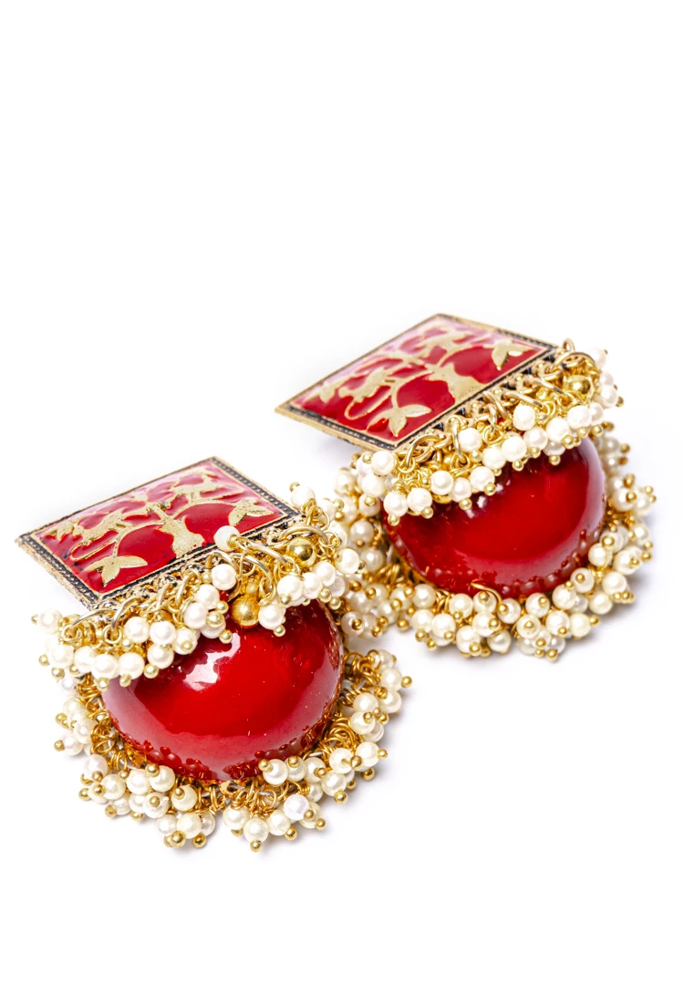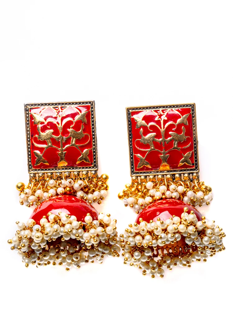 Jhumka earring with red colour and gold-tone finish featuring square shaped top with red coloured enamel inlay and fine meenakari detailing adorned with a series of small circular pearl beads at the edges and a push back closure