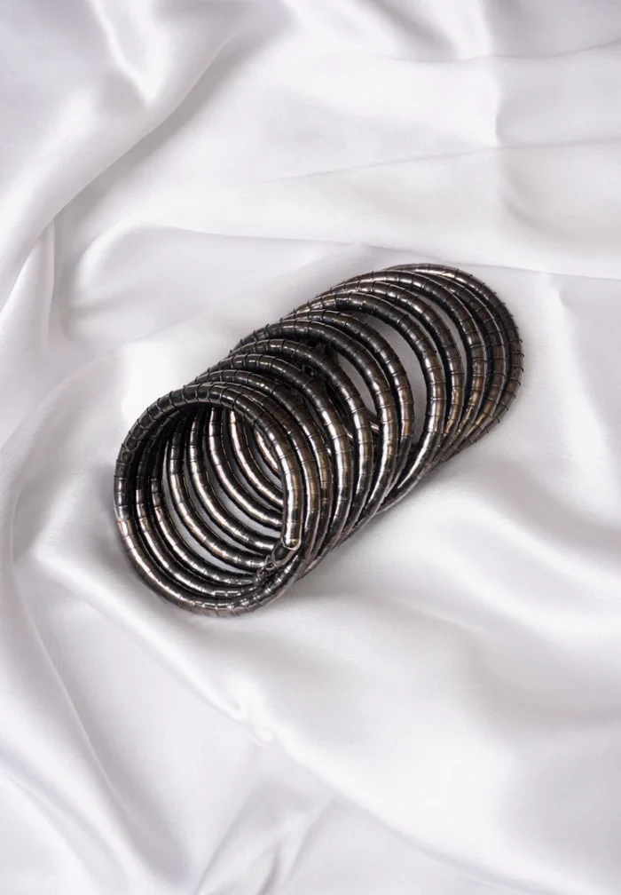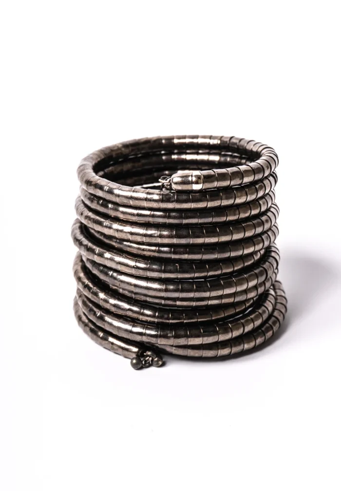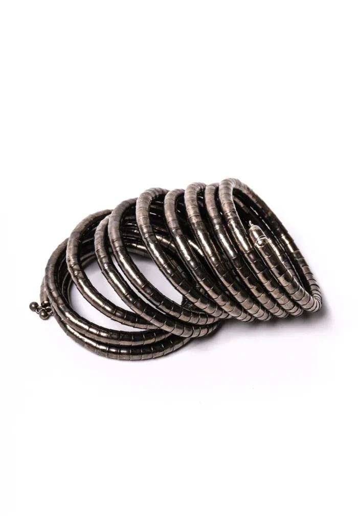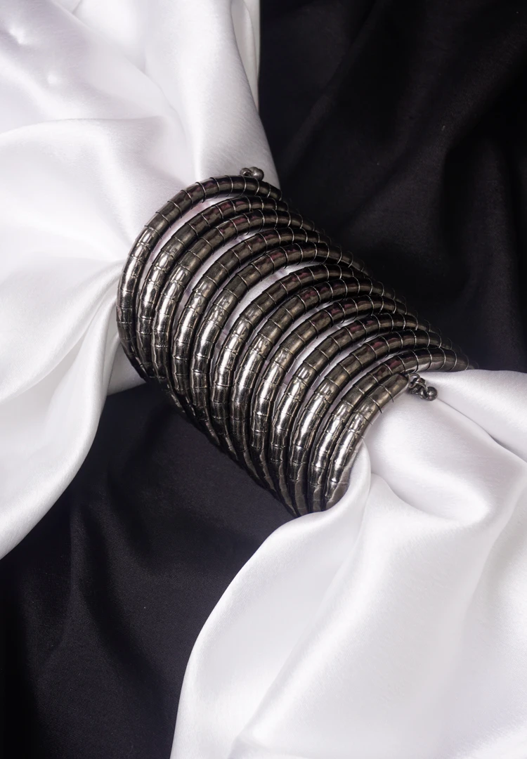 Multi layered metal spiral bracelet with textured oxidised silver-tone finish featuring two small circular beads on both the edges