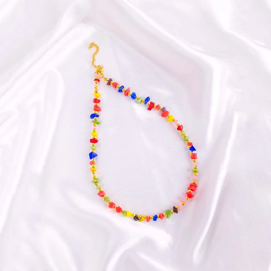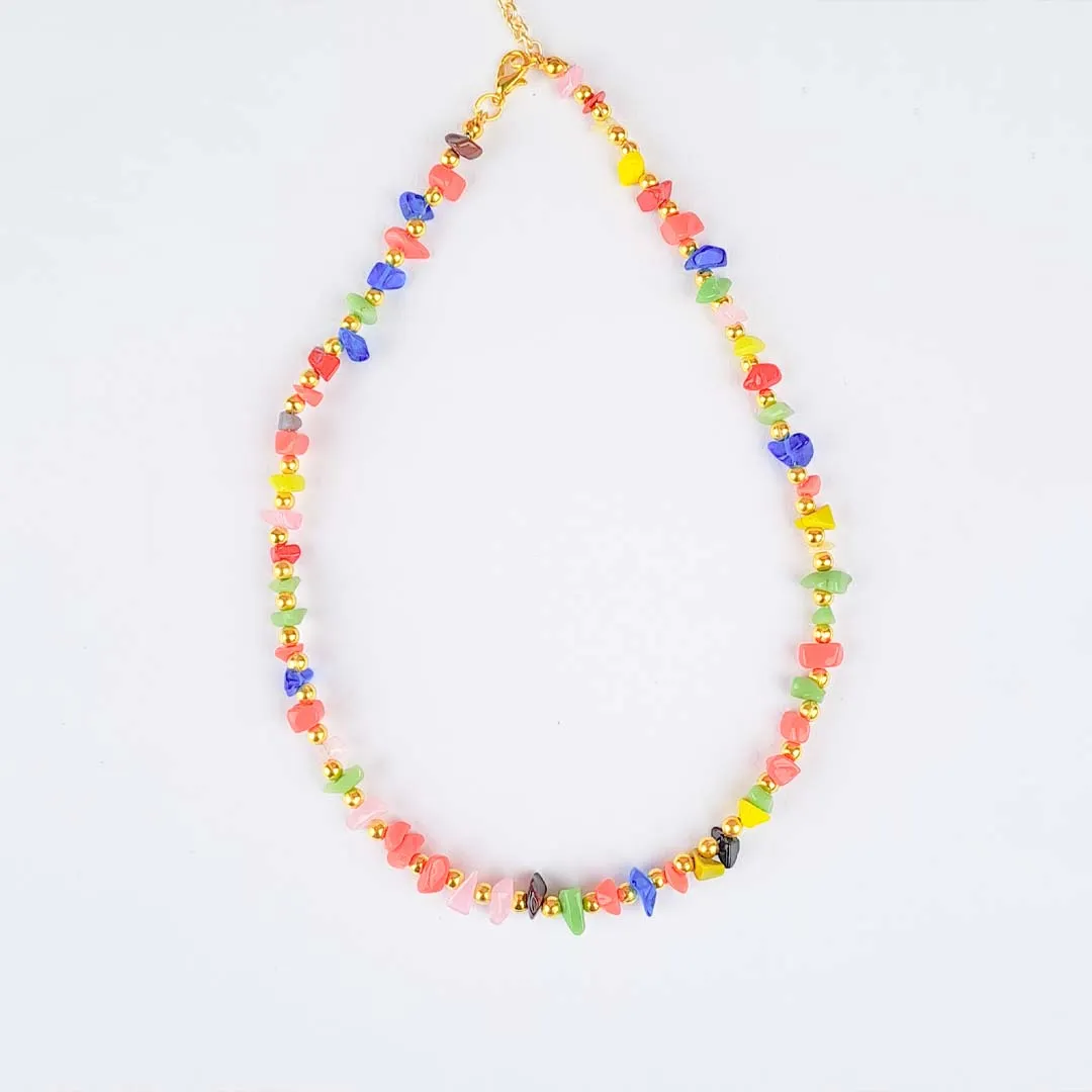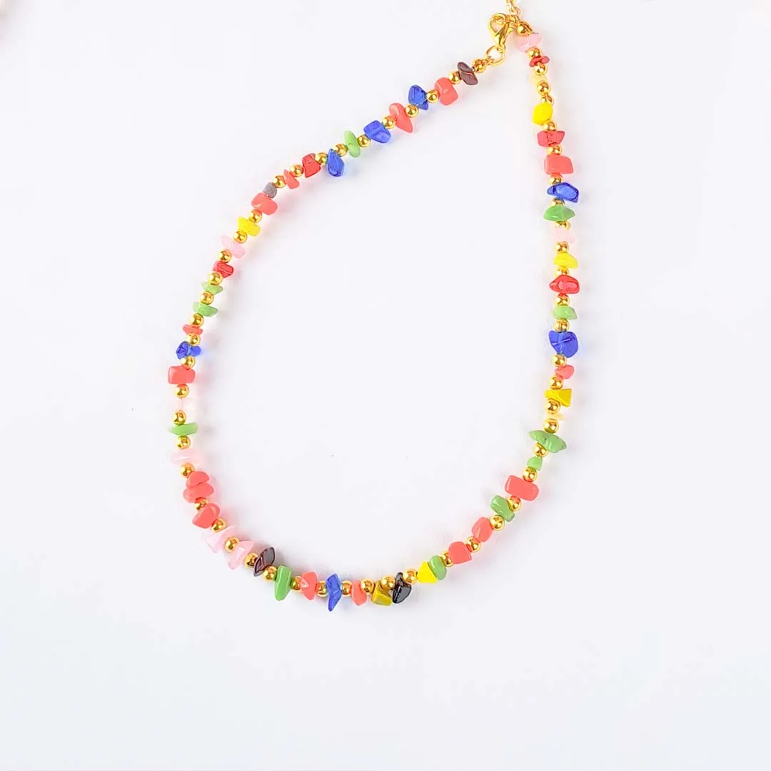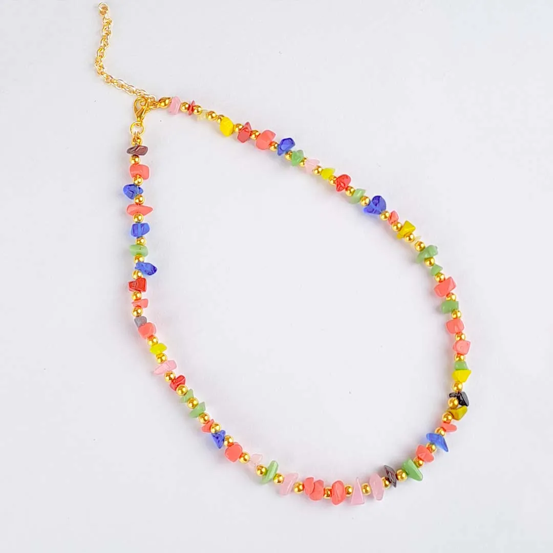 Bohemian-inspired necklace strung with irregular multicolor chip beads, featuring smooth polished gold-tone spacers for extra shine. The necklace offers a playful, organic mix of colourful beads with a vibrant matte and glossy finish. Completed with an adjustable gold-plated extender chain and lobster clasp.