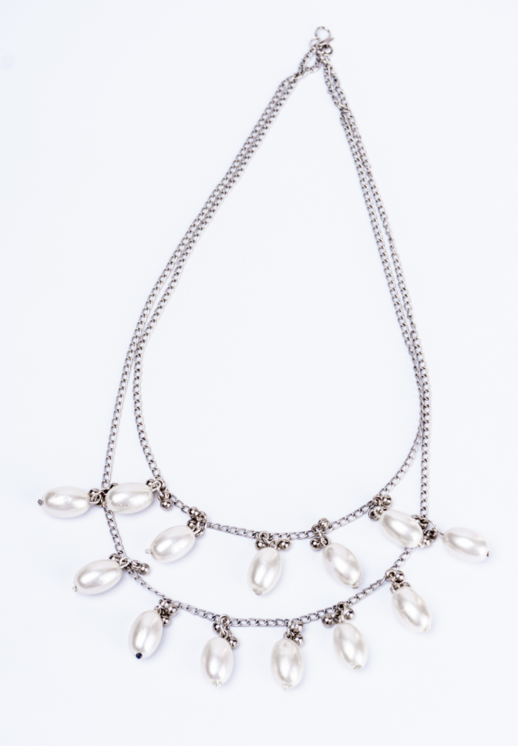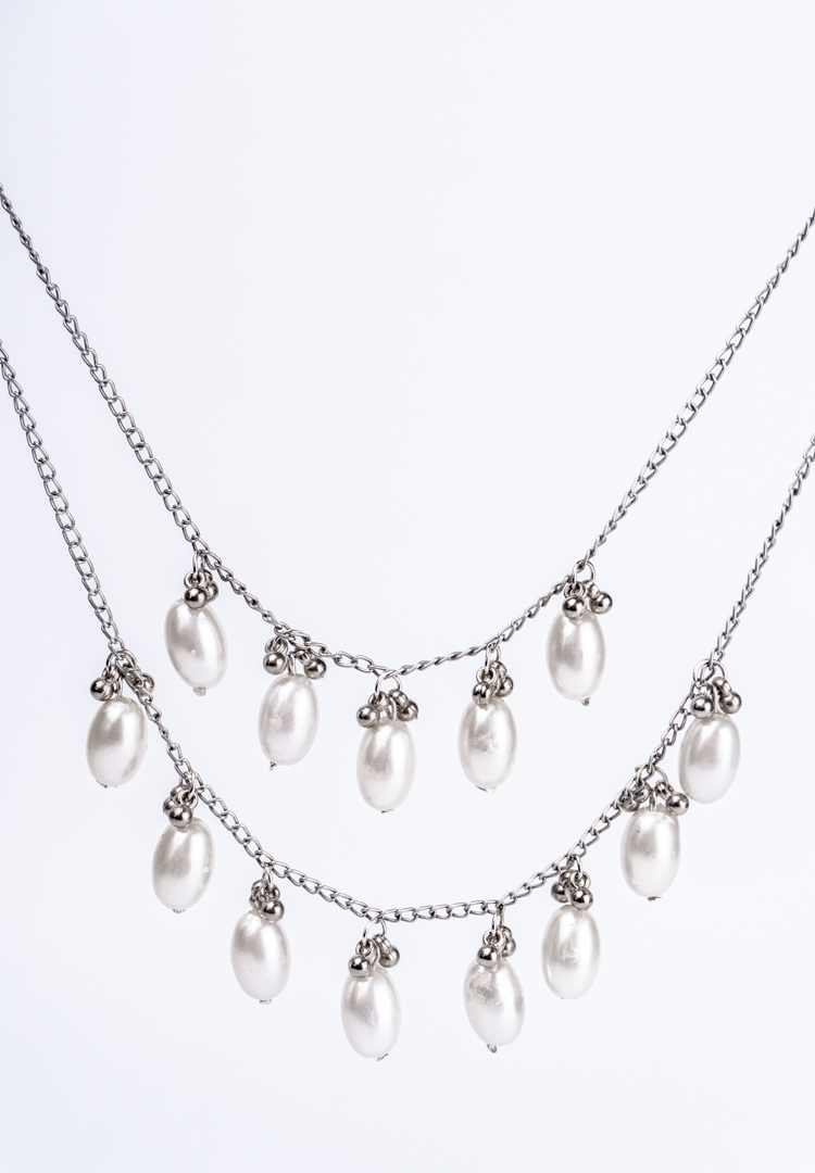 Double layered curb chain necklace of varying lengths and polished silver tone finish adorned with oval shaped pearls and small circular beads at the curves and a s hook closure
