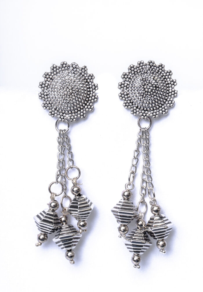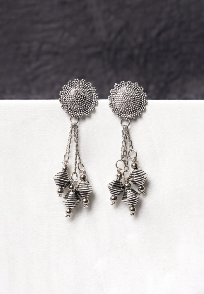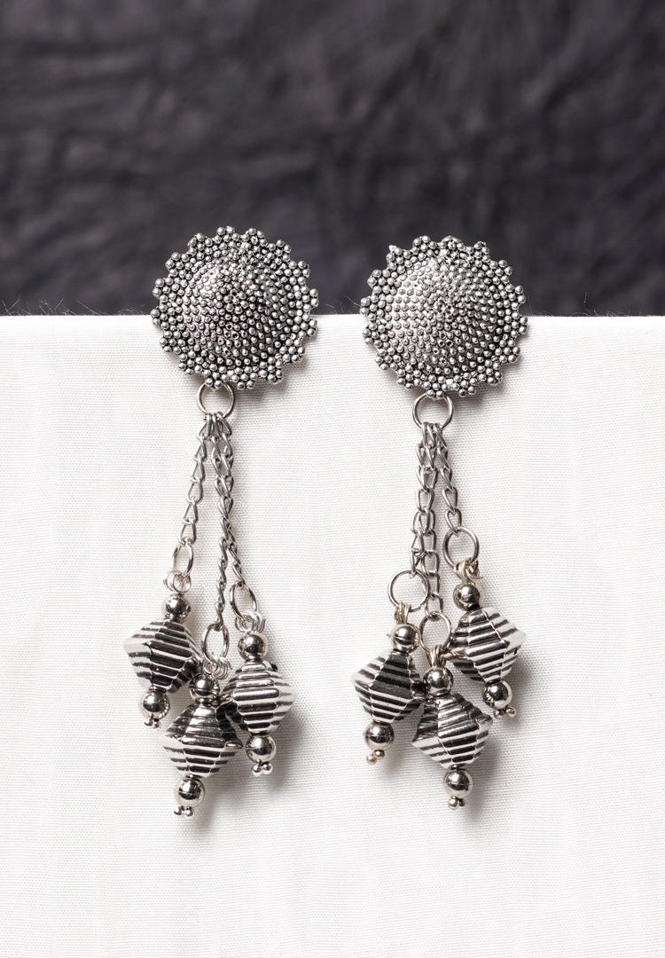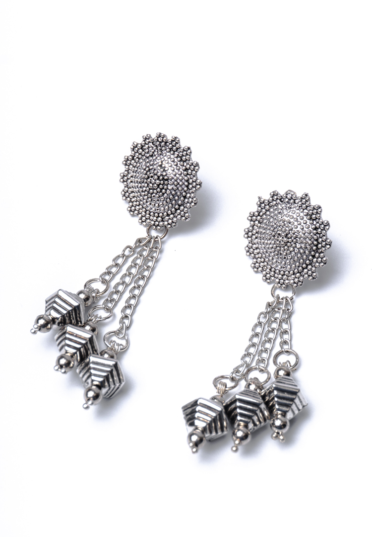 Metal dangle earring with beaded designed circular top with oxidised silver tone finish featuring delicate chain tassels of varying lengths adorned with textured geometric shaped designs and circular beads at the edges with a push back closure