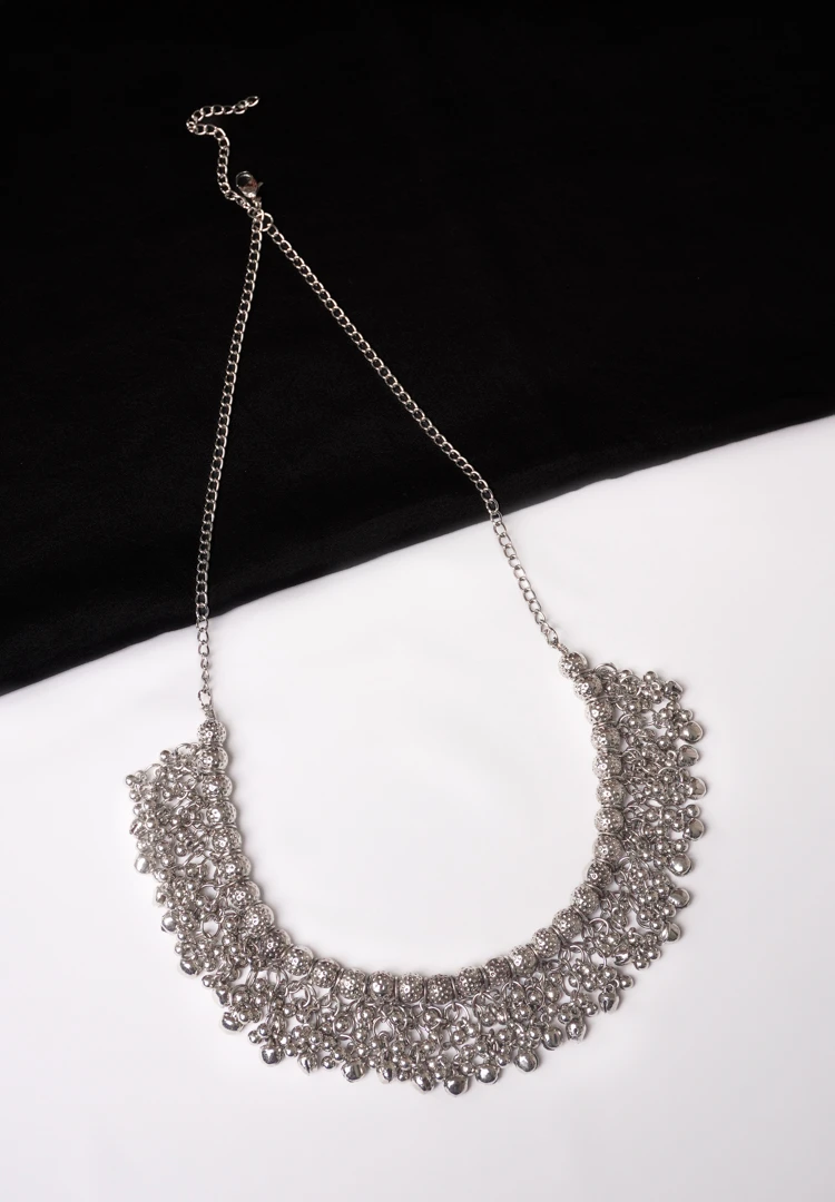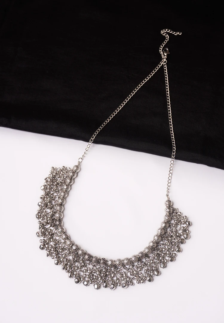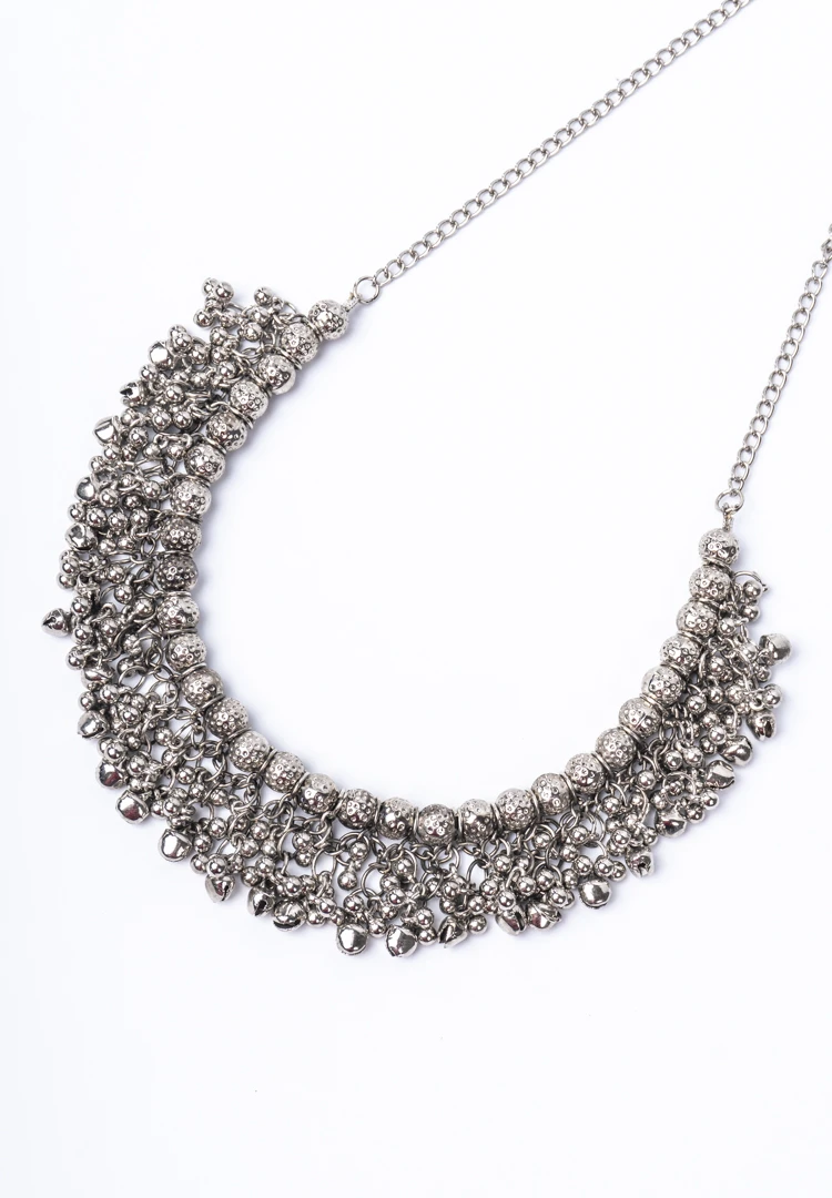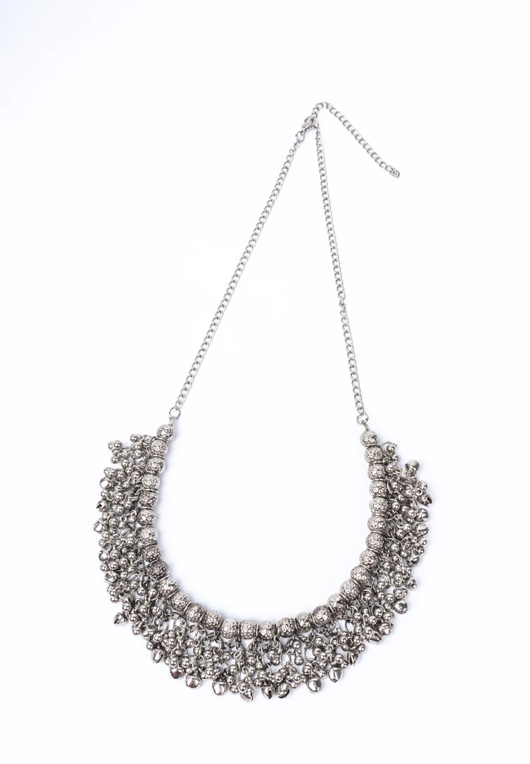 Metal curb chain necklace with oxidised silver tone finish featuring a series of circular beads adorned with ghungroos and a lobster claw clasp