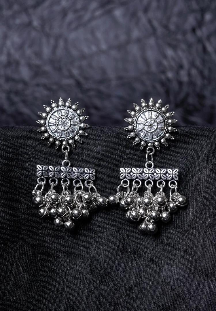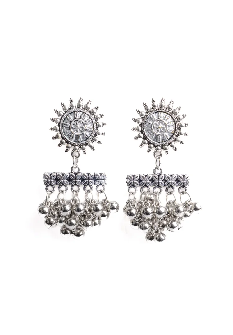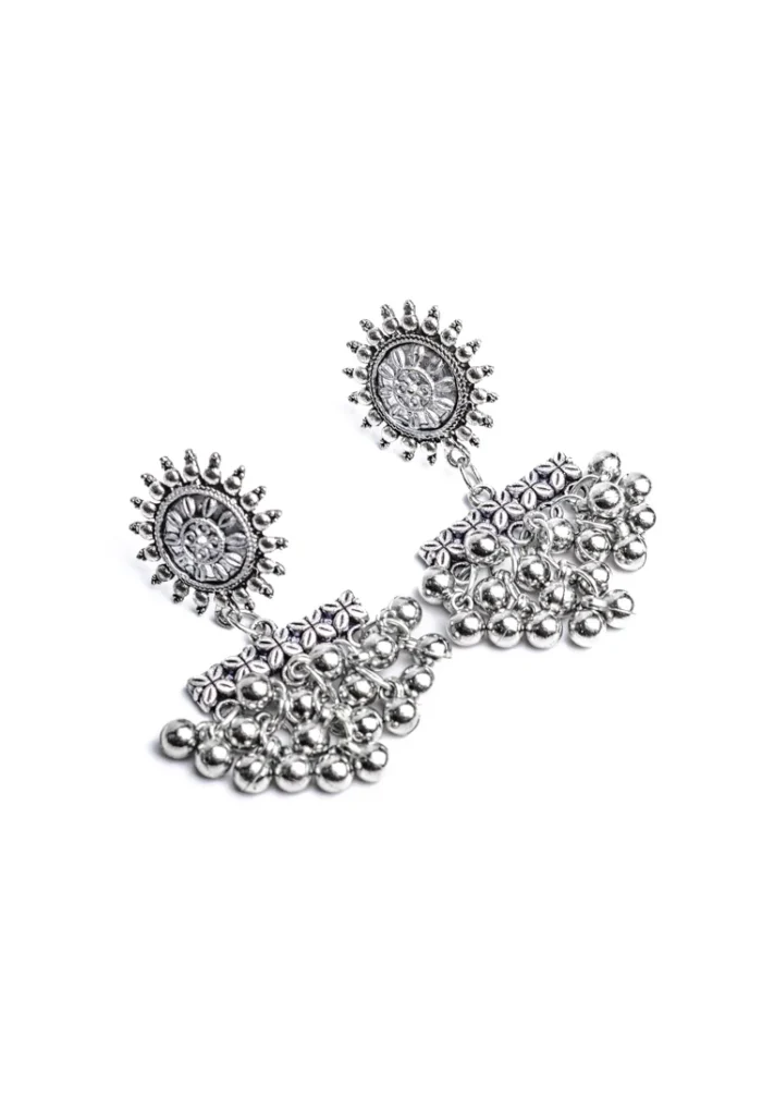 Metal dangle earring with circular top and floral detailing adorned with circular beads and a push back closure