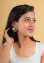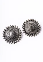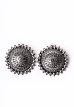 Large circular metal stud earring with oxidised silver tone finish featuring fine intricate design surrounded with evenly spaced circular beads and a push back closure