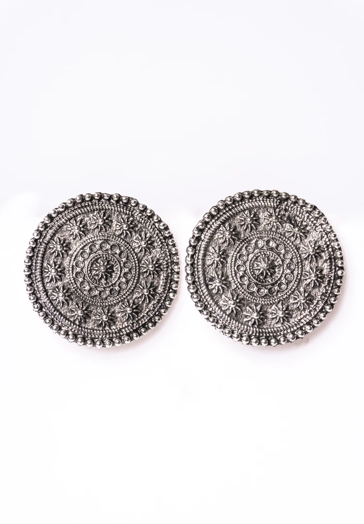 Large circular metal stud earring with oxidised silver tone finish featuring finenintricate floral design surrounded with small circular beads and a push back closure