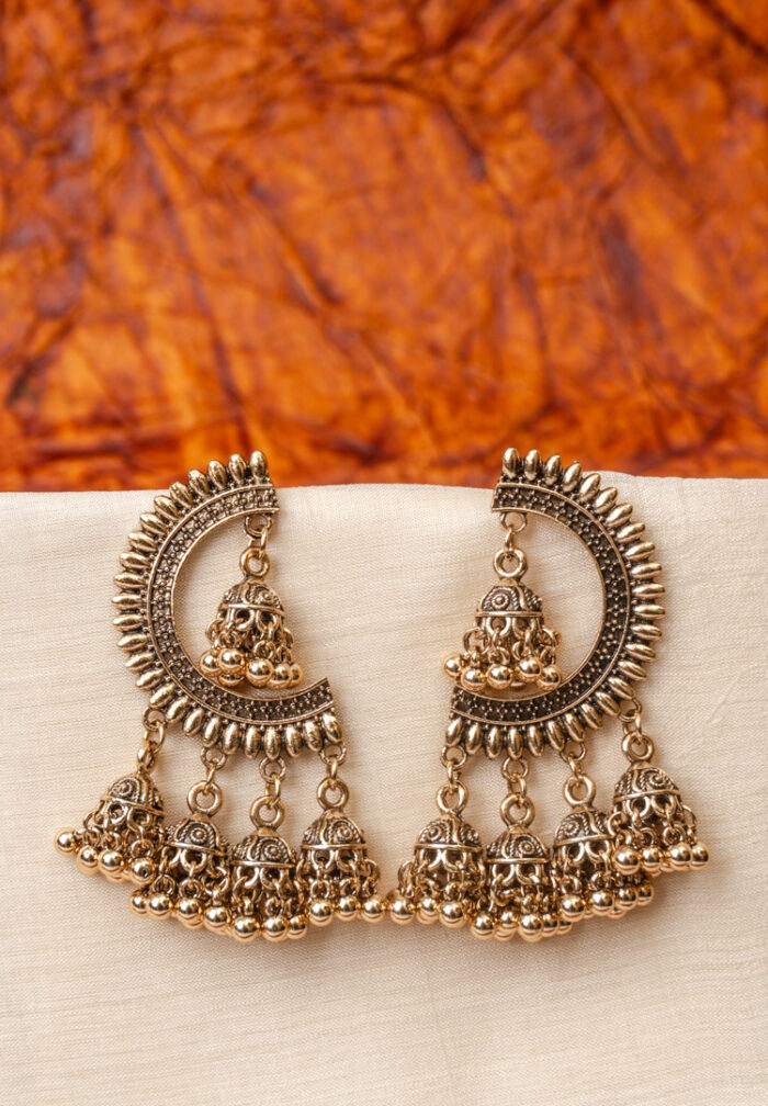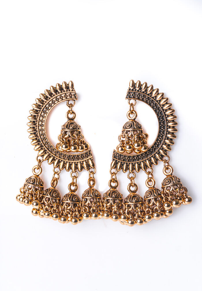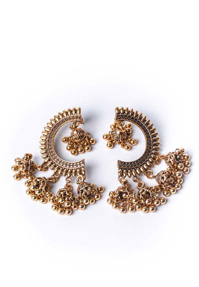 Metal jhumka earring with oxidized golden/silver finish featuring a dome-shaped design adorned with intricate engravings and dangling metallic beads with a wire hook closure