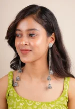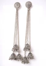 Metal chain dangle earring with fine detailed circular top and oxidised silver tone finish featuring long chain tassels of varying lengths adorned with intricate detailed jhumkas and ghungroos at the edges with a push back closure