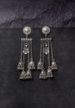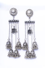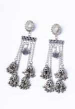 Geometric shaped dangle earring with fine intricate detailing featuring a detailed circular top with fine chain tassel of varying lengths adorned with jhumkas and ghungroos with a floral shaped design at the centre and a push back closure