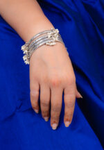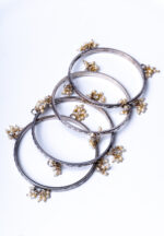 Set of bangles with polished silver tone finish featuring silver-toned bangles with intricate engravings adorned with small dangling pearl beads