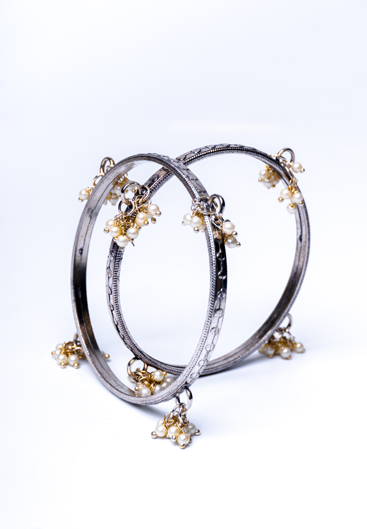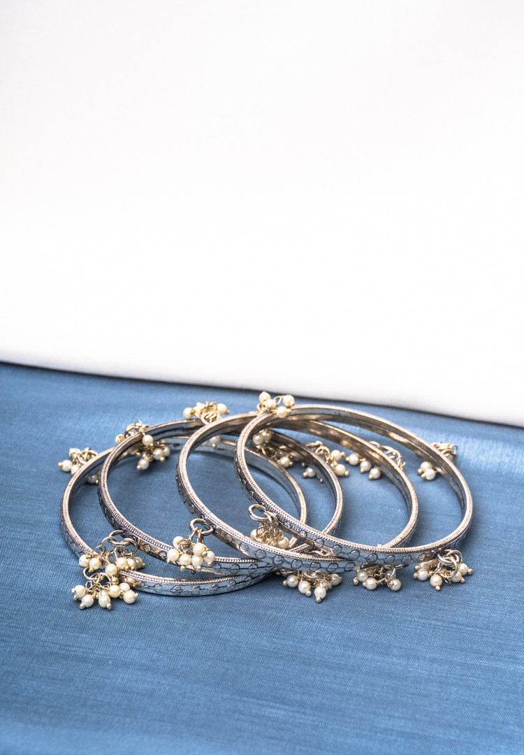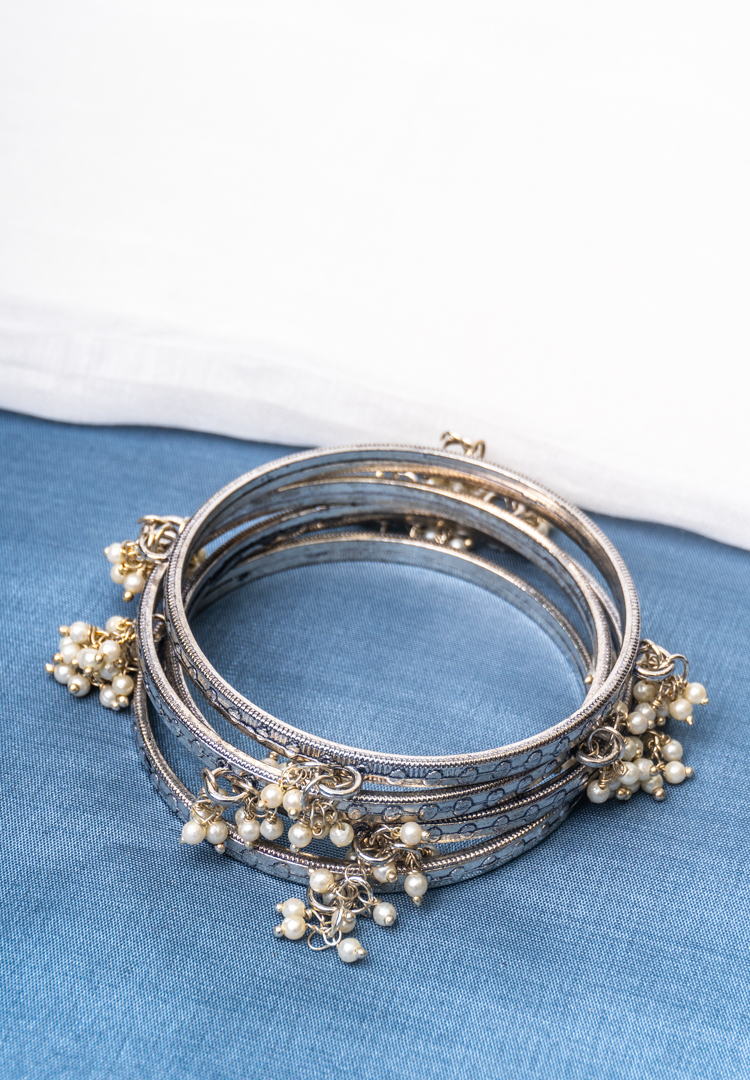 Set of bangles with polished silver tone finish featuring silver-toned bangles with intricate engravings adorned with small dangling pearl beads