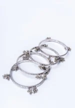 Set of bangles with polished silver tone finish featuring silver-toned bangles with intricate engravings adorned with small dangling silver beads