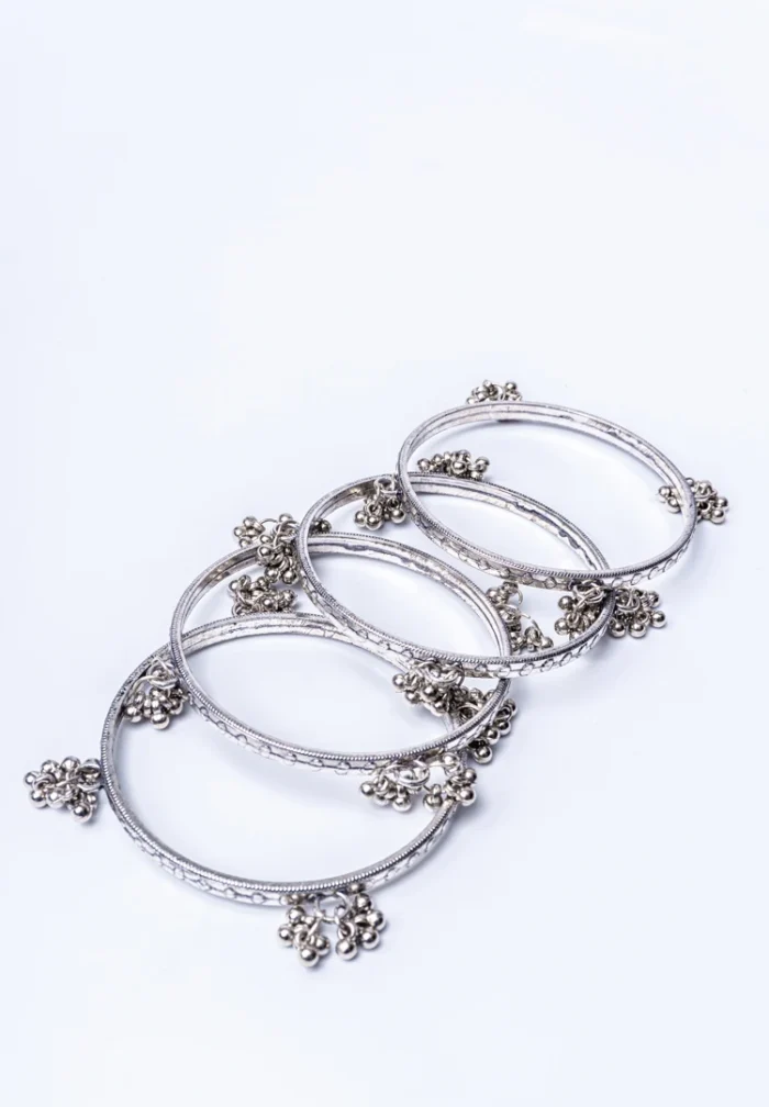 Set of bangles with polished silver tone finish featuring silver-toned bangles with intricate engravings adorned with small dangling silver beads