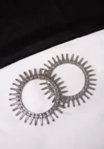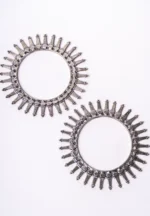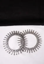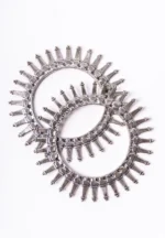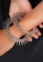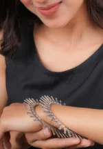 Set of bangles with fine intricate detailing and oxidised silver tone finish featuring a series of cone like structure adorned with small circular beads