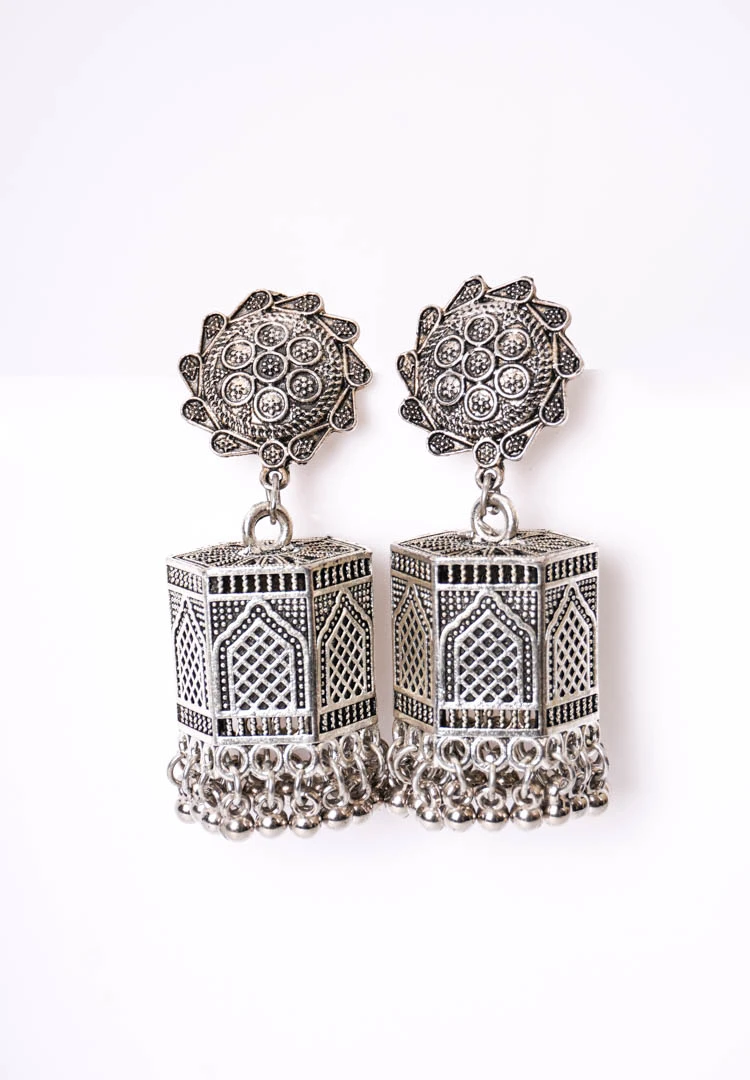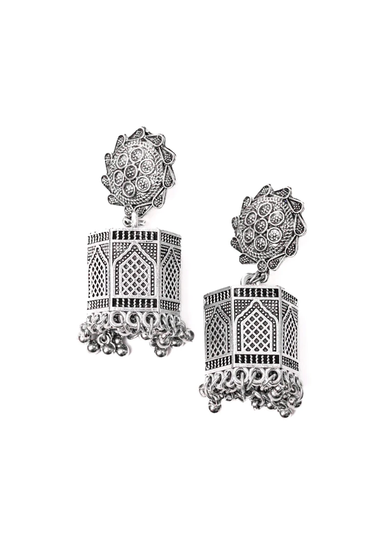 Metal jhumka earring with fine intricate detailing and oxidised silver-tone finish adorned with ghungroos at the bottom and a french hook closure