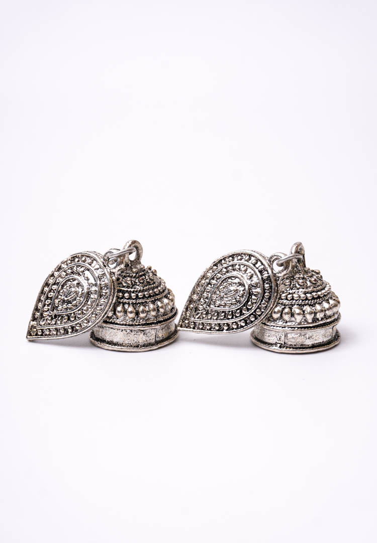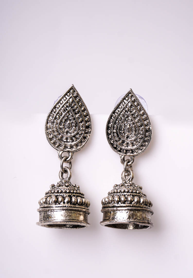 Metal jhumka earring with fine inricate detailing and oxidised silver-tone finish featuring a fine detailed teardrop shaped top and a push back closure