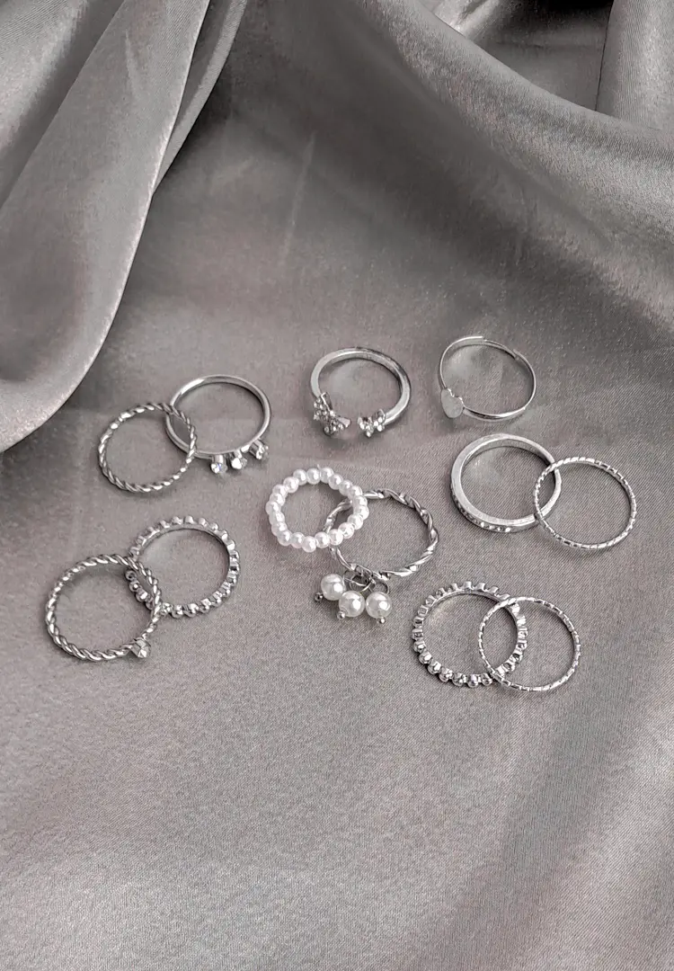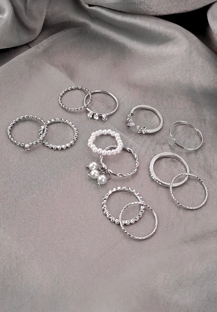 Pack of 12 Eclectic Silver Pearl Sparkling Rings Combo