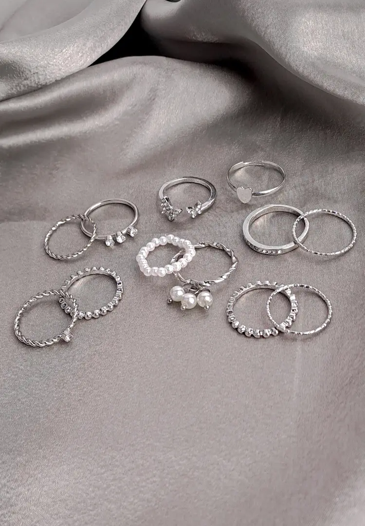 Transform your hands with this extensive 12-piece silver-toned ring collection designed for bold, layered stacking. This set perfectly blends essential textures, delicate pearls, and sparkling crystal accents for a cohesive, bohemian-luxe aesthetic. It features a Pearl Drop Ring, Crown Band, Rope Bands, and Crystal Bands, seamlessly transitioning from everyday to special events.