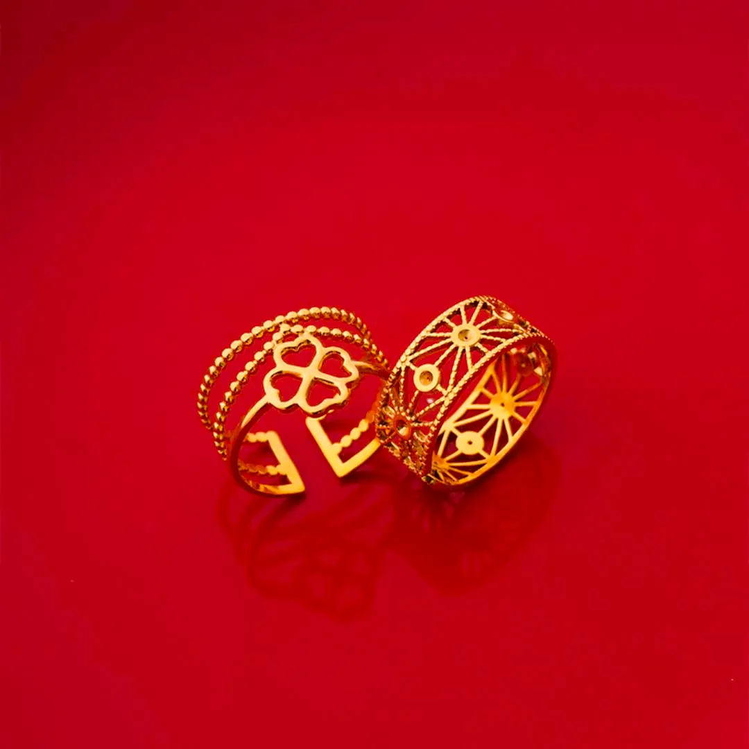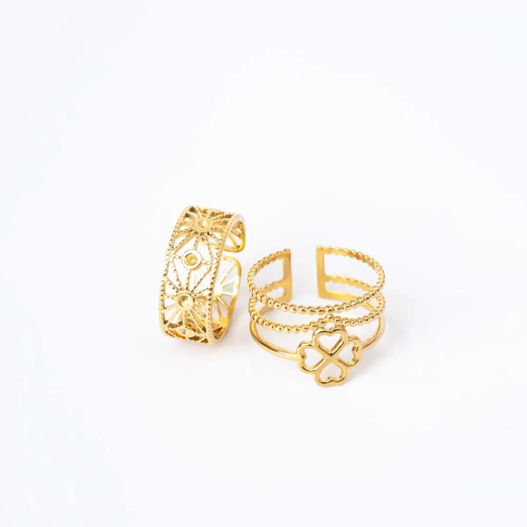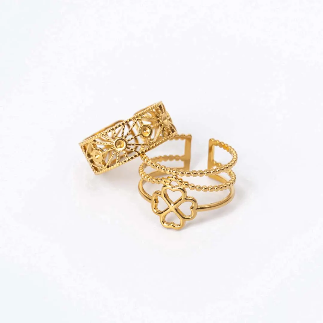 Pack of gold-toned rings featuring two open-design bands featuring a modern floral designed cuff ring with beaded patterns along with a floral designed band with geometric patterns