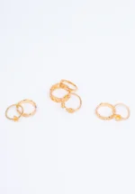 Set of seven gold-toned rings featuring intricate openwork designs from heart shaped, floral, textured, abstract designed ring. Elegant and cool looking set
