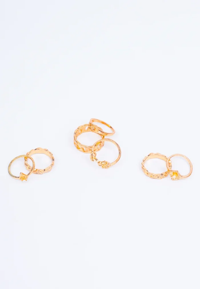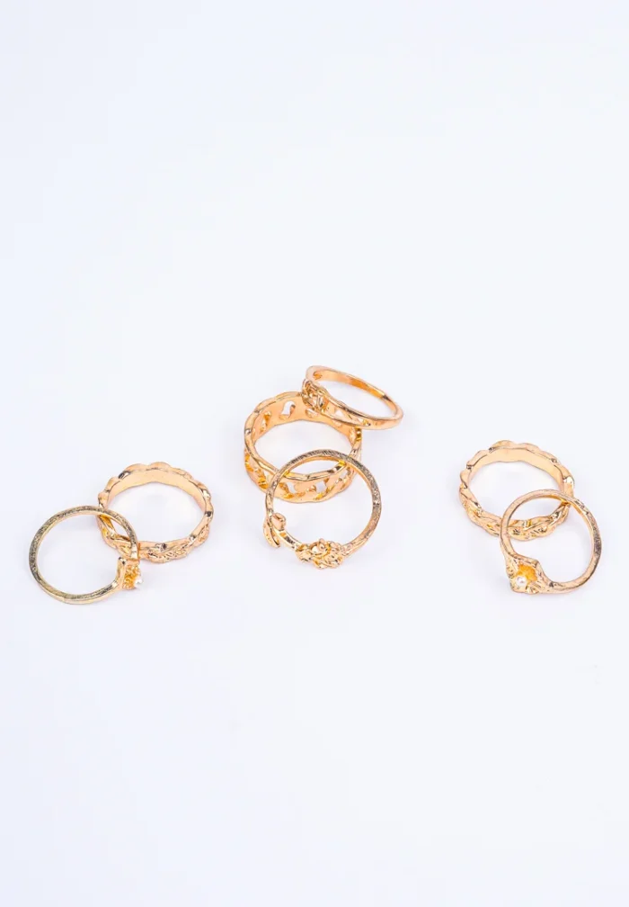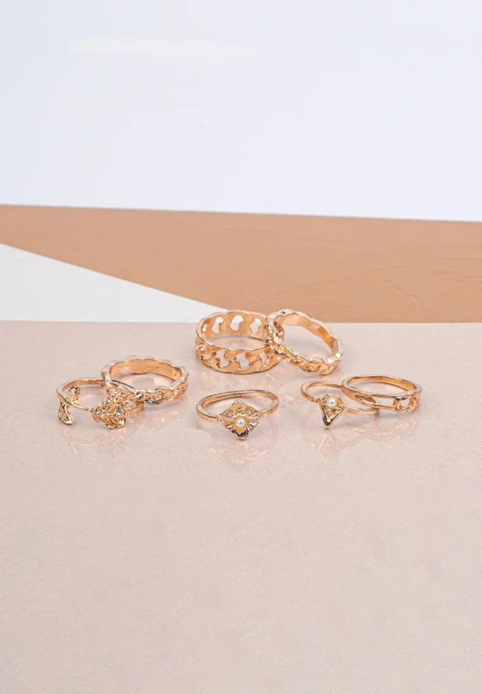 Set of seven gold-toned rings featuring intricate openwork designs from heart shaped, floral, textured, abstract designed ring. Elegant and cool looking set
