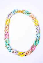 Chain-link necklace featuring series of interconnected colorful and golden tone multicolor metal links with a golden hook clasp