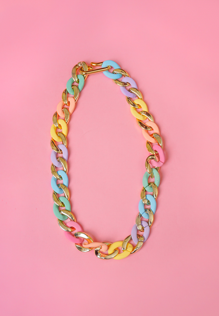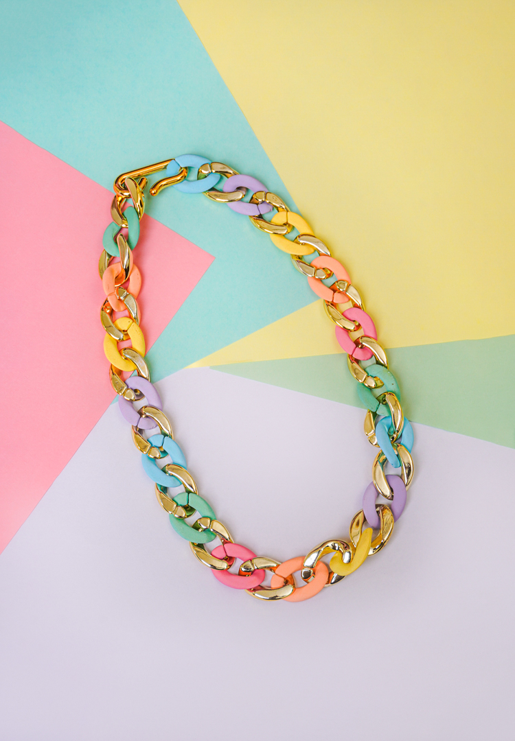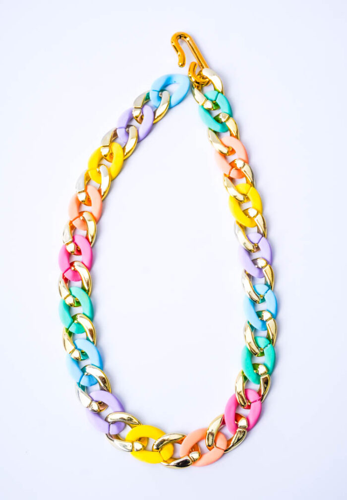Chain-link necklace featuring series of interconnected colorful and golden tone multicolor metal links with a golden hook clasp