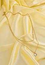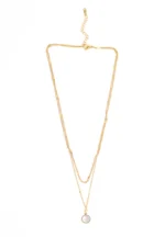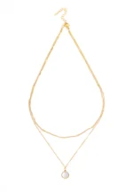Golden layered chain necklace with a small round mirror white pendant having a lobster clasp