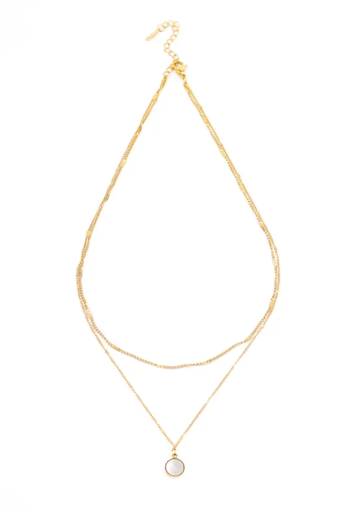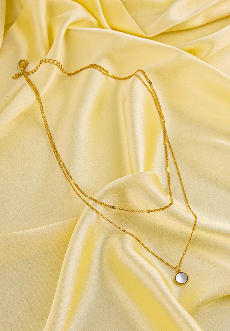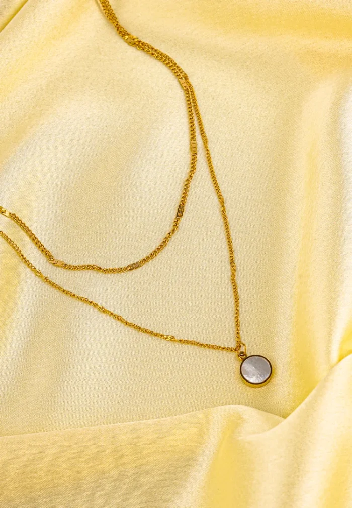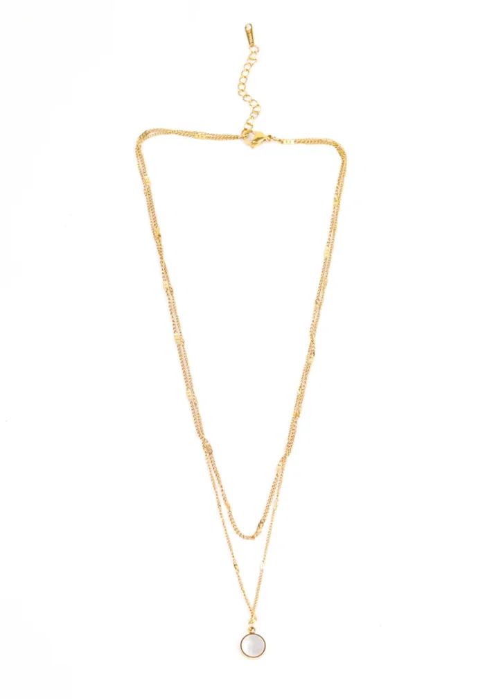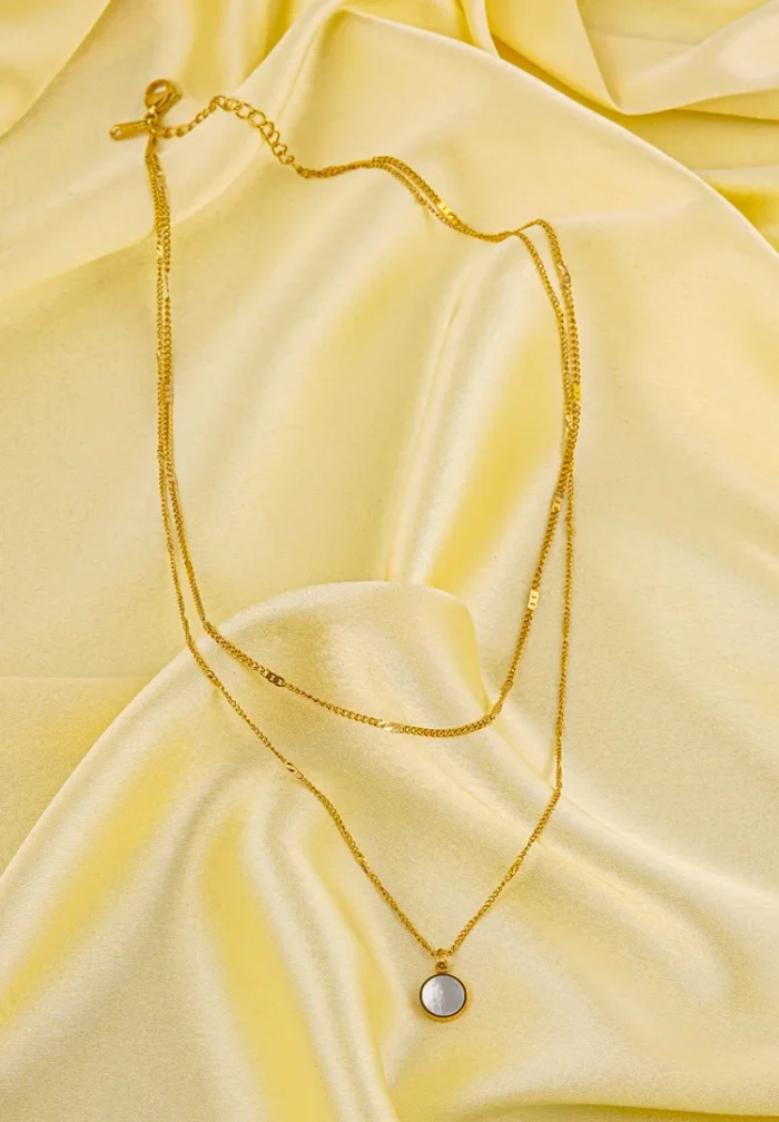 Golden layered chain necklace with a small round mirror white pendant having a lobster clasp