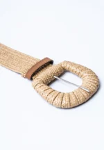 Textured woven straw belt in a natural beige colour featuring a geometric shaped braided buckle