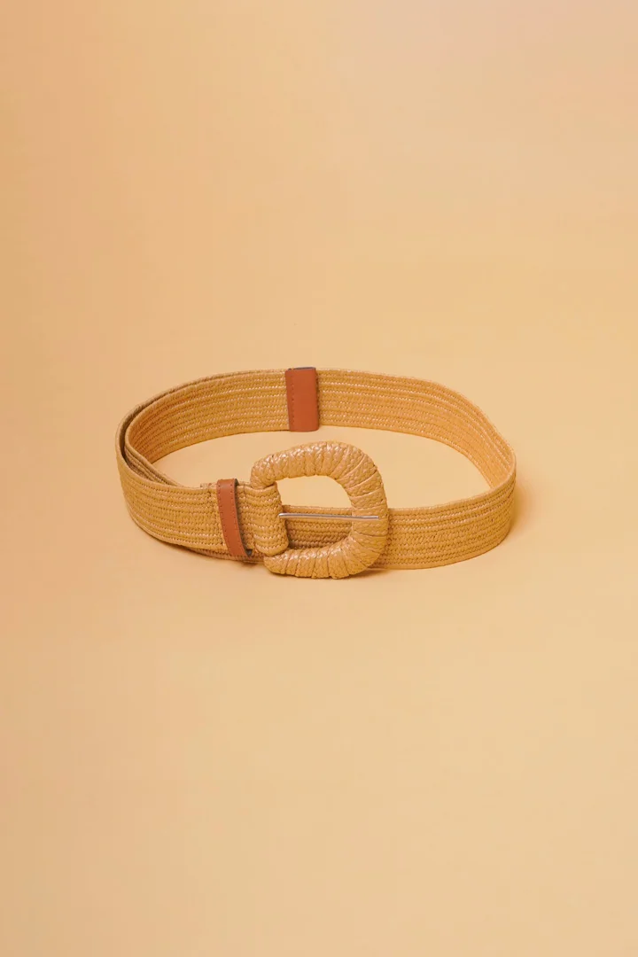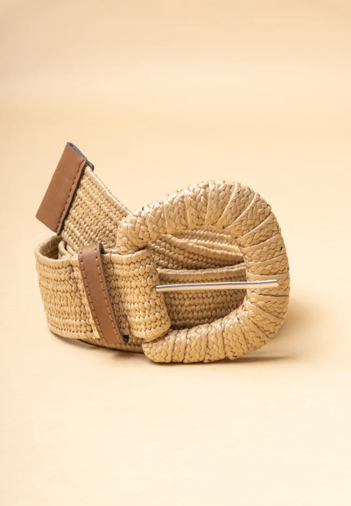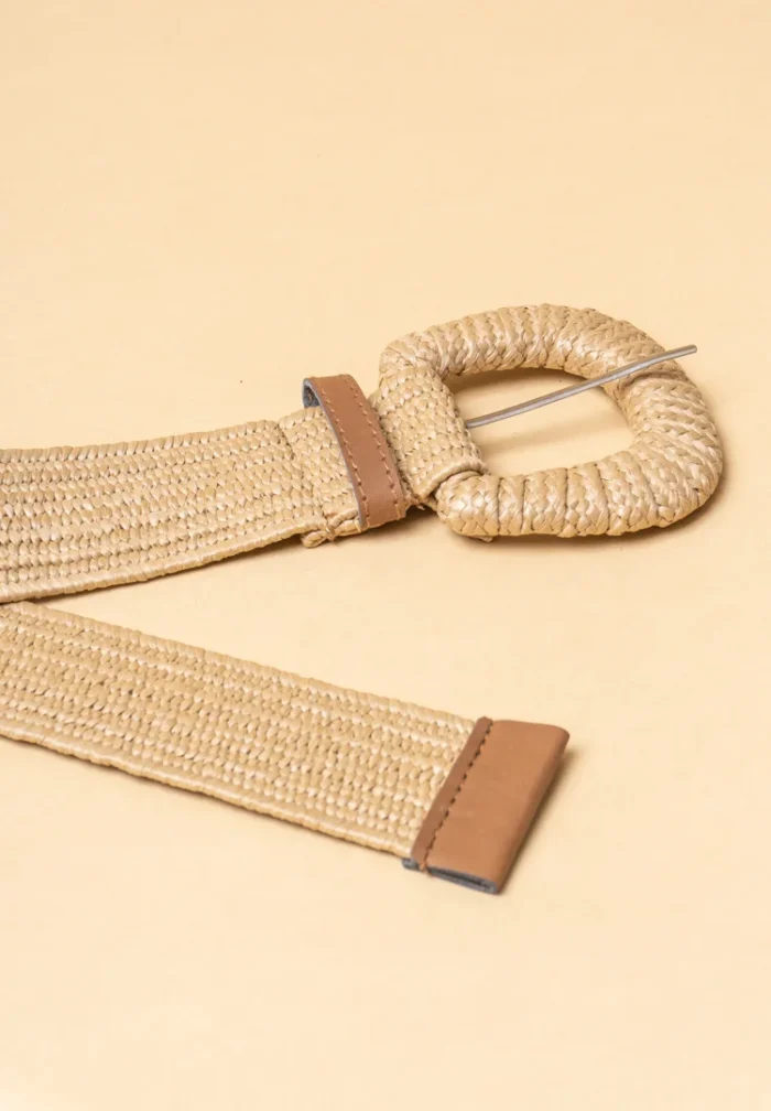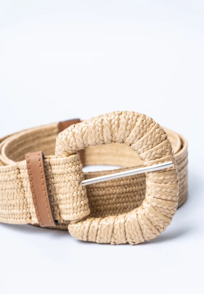 Textured woven straw belt in a natural beige colour featuring a geometric shaped braided buckle