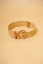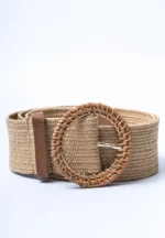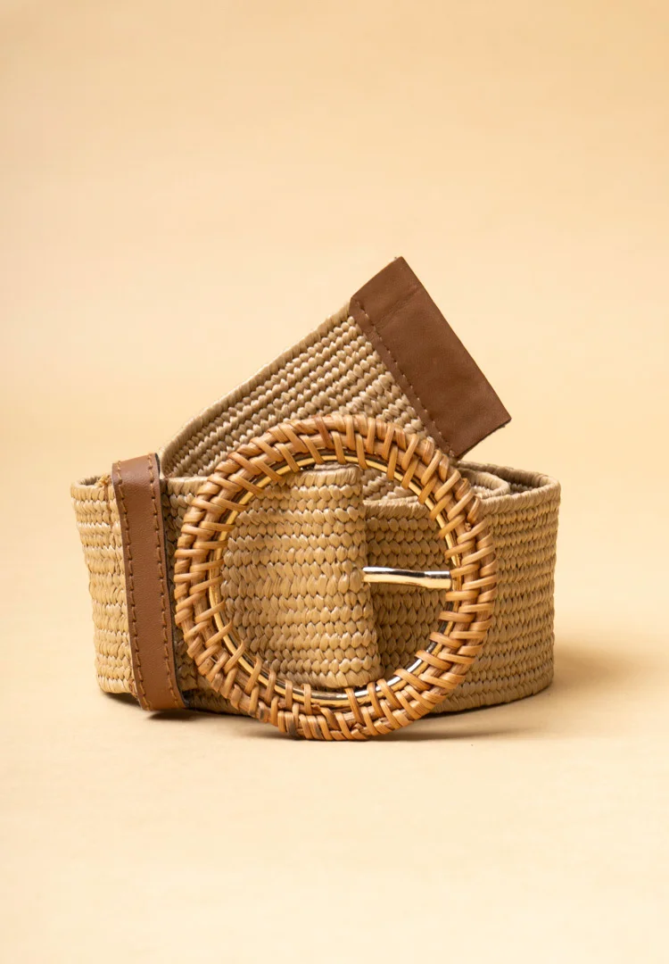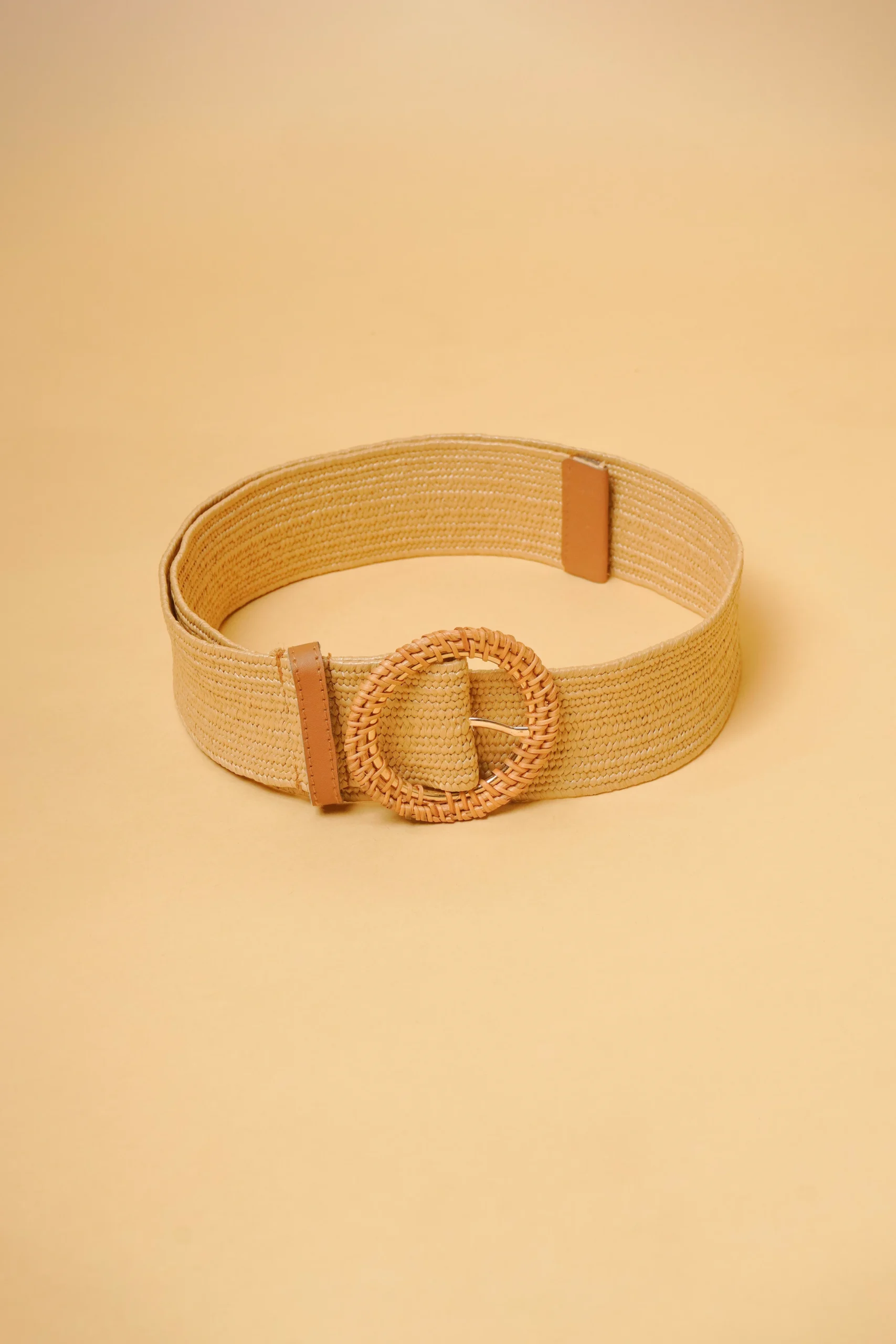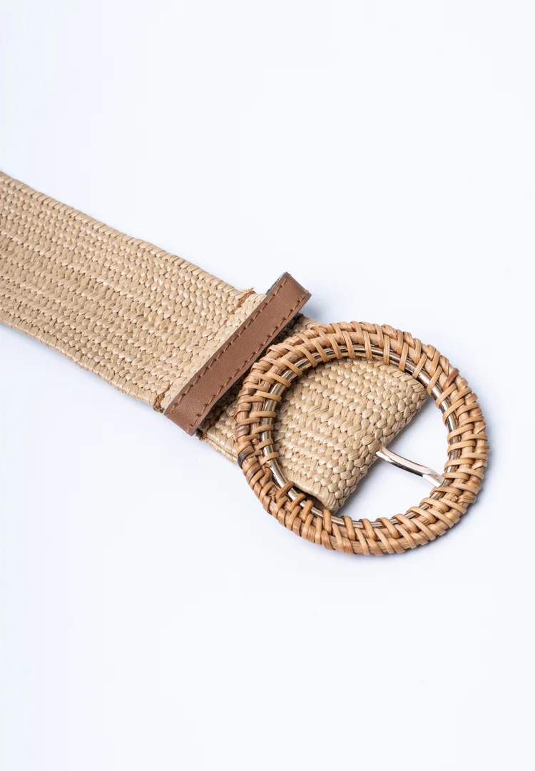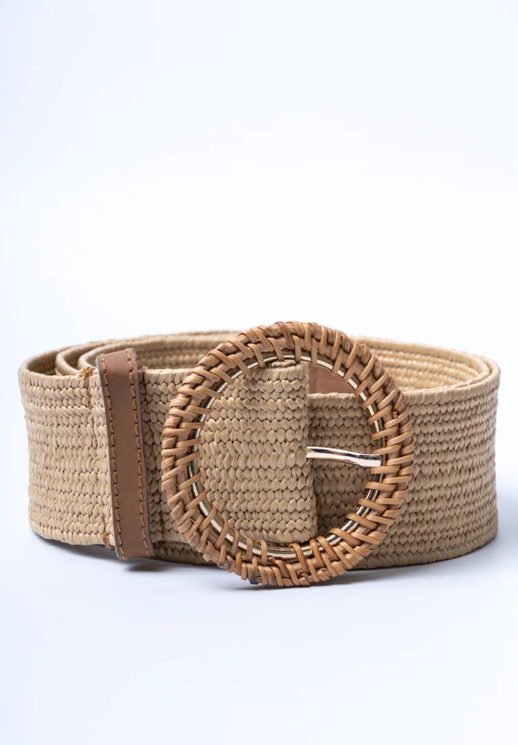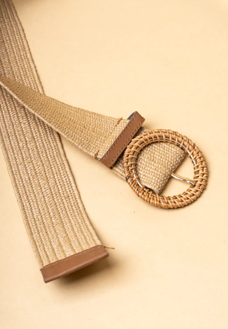 Textured woven straw belt in a natural beige colour featuring a woven circular shaped buckle
