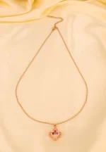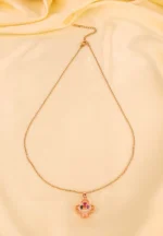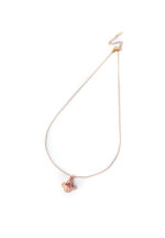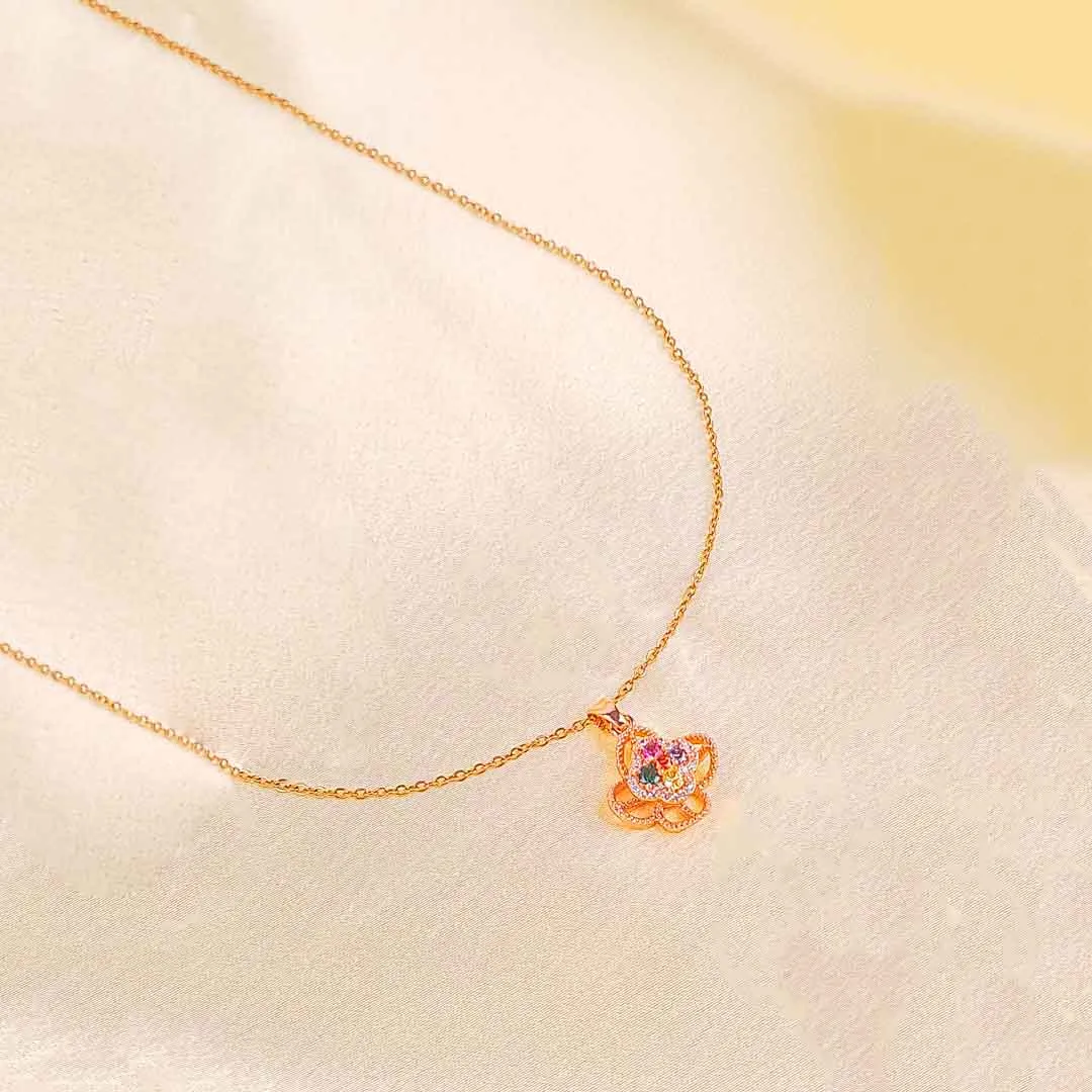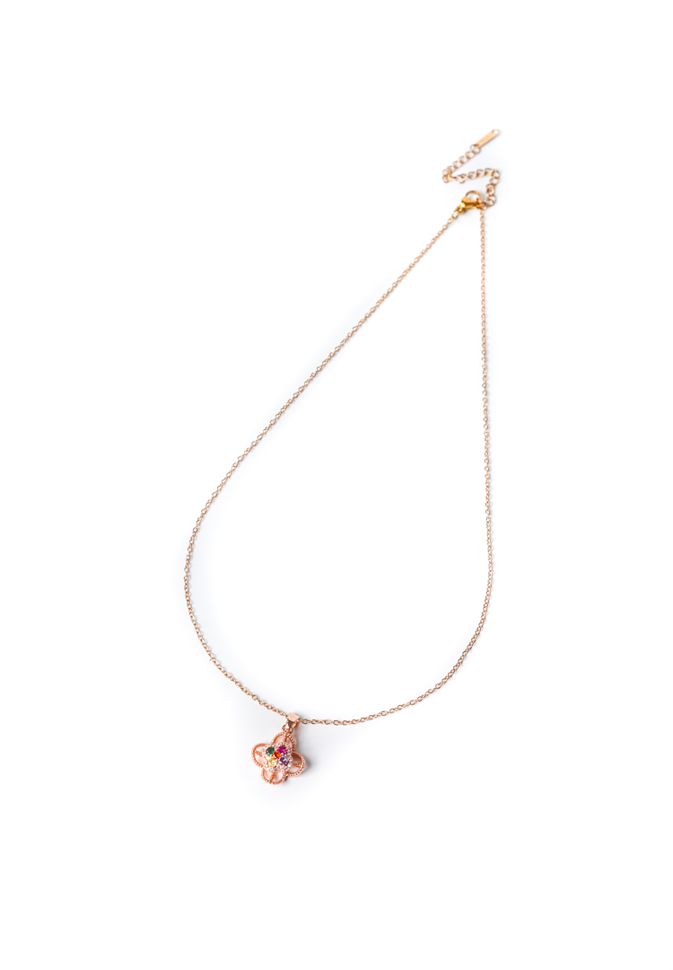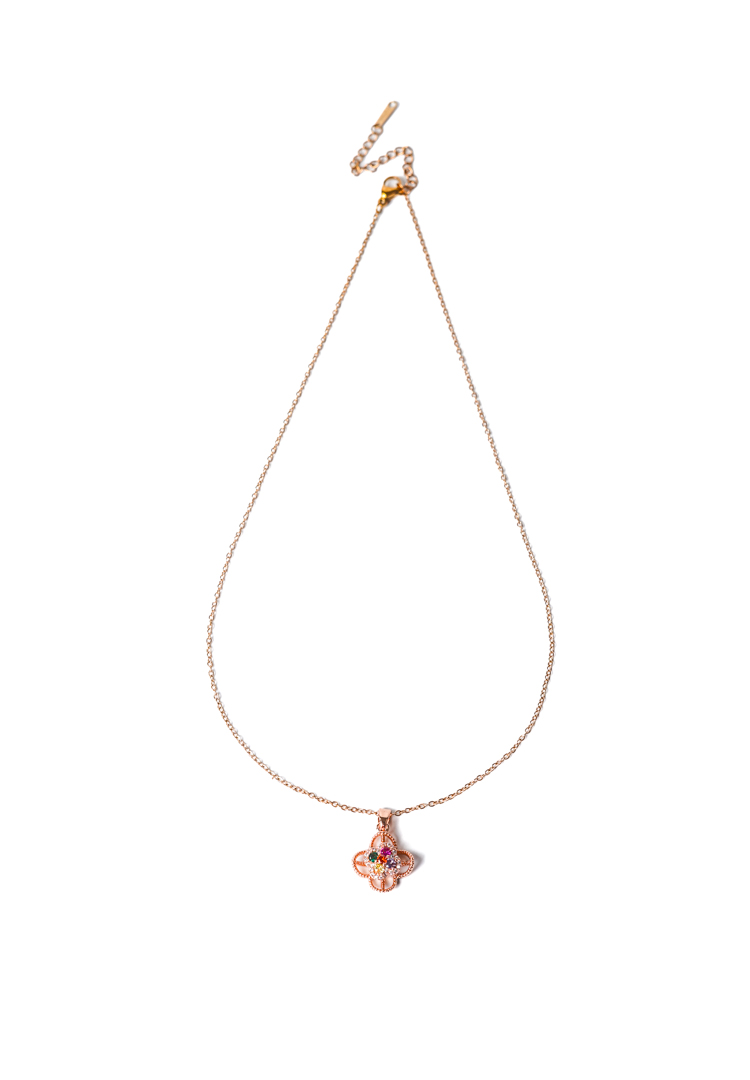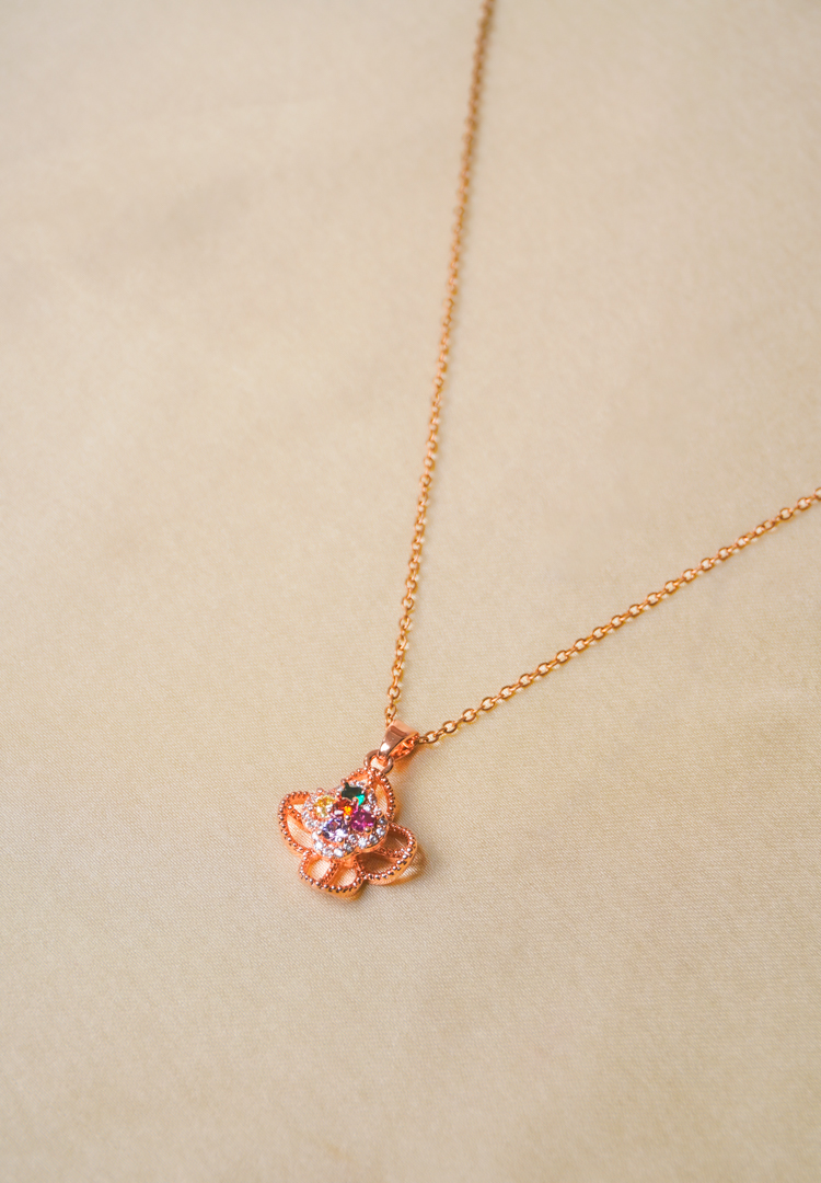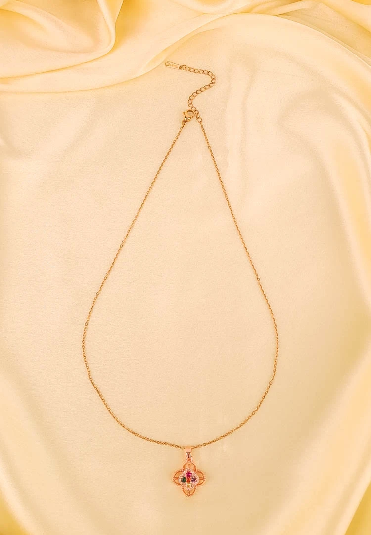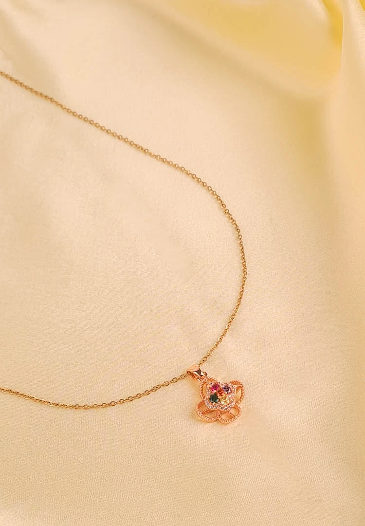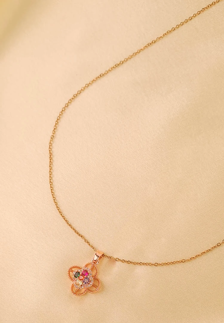 Rose gold tone metal curb chain necklace adorned with spinning flower shaped pandent with colourful stone placed in the centre and a lobster claw clasp