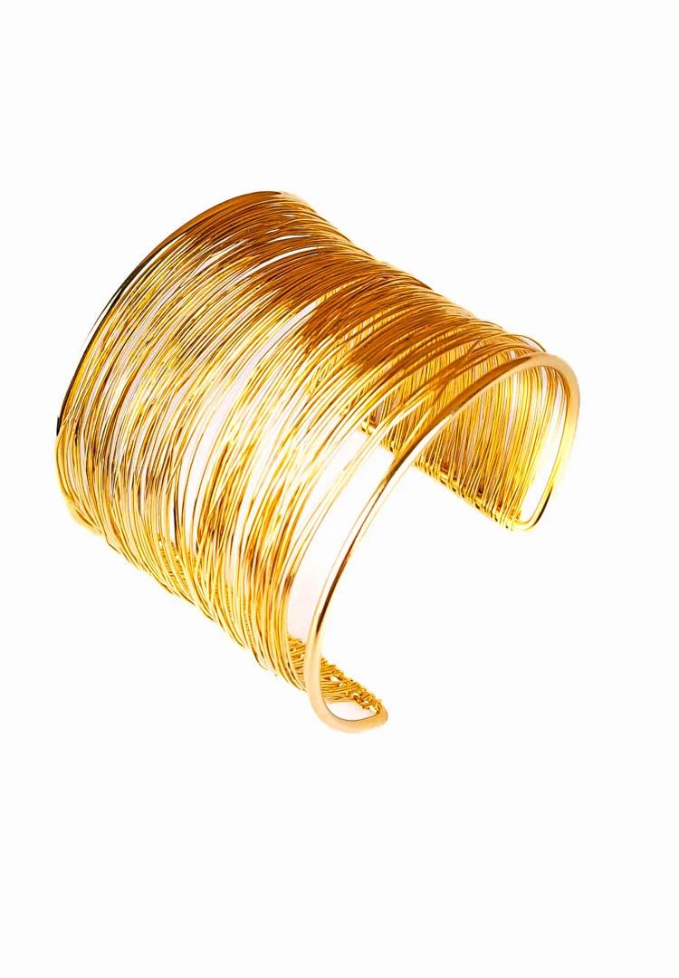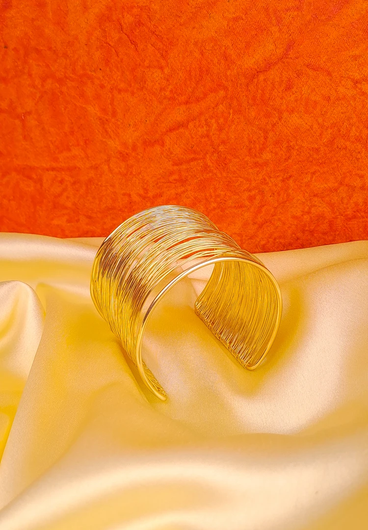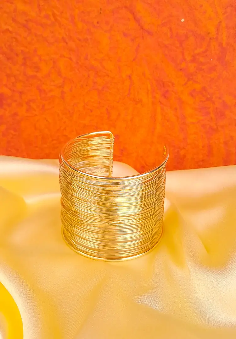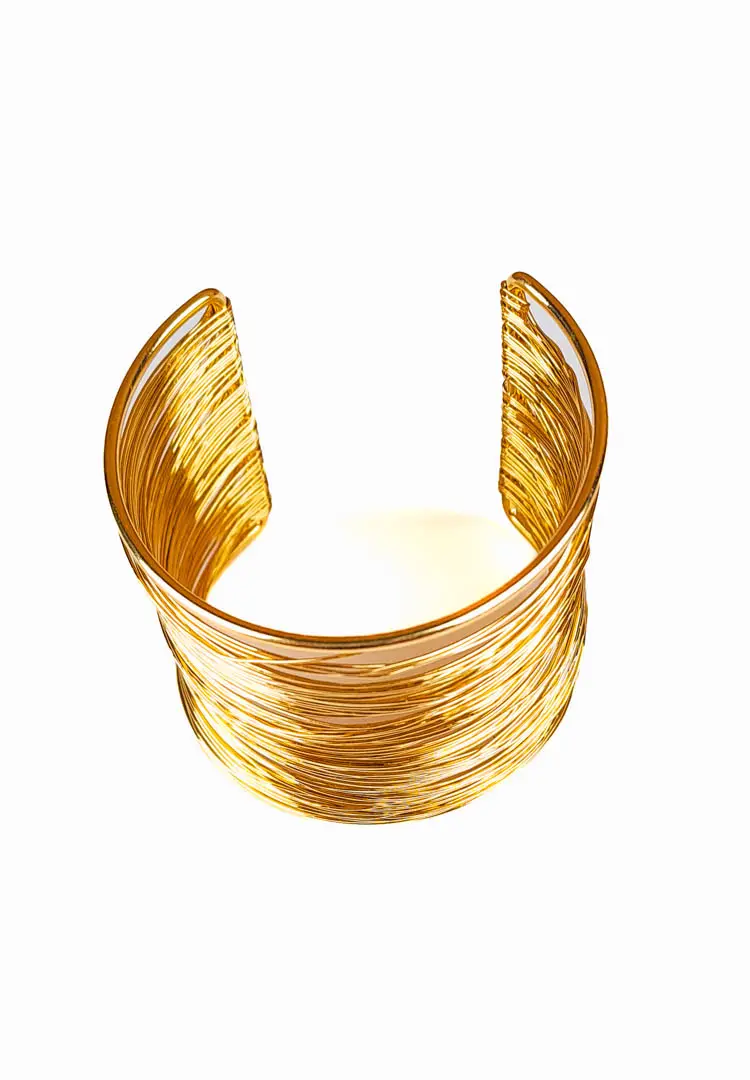 Statement cuff bracelet crafted from layers of fine metallic wires in a sculptural open-ended form, showcasing a polished finish with flexible construction for easy wear and modern style.