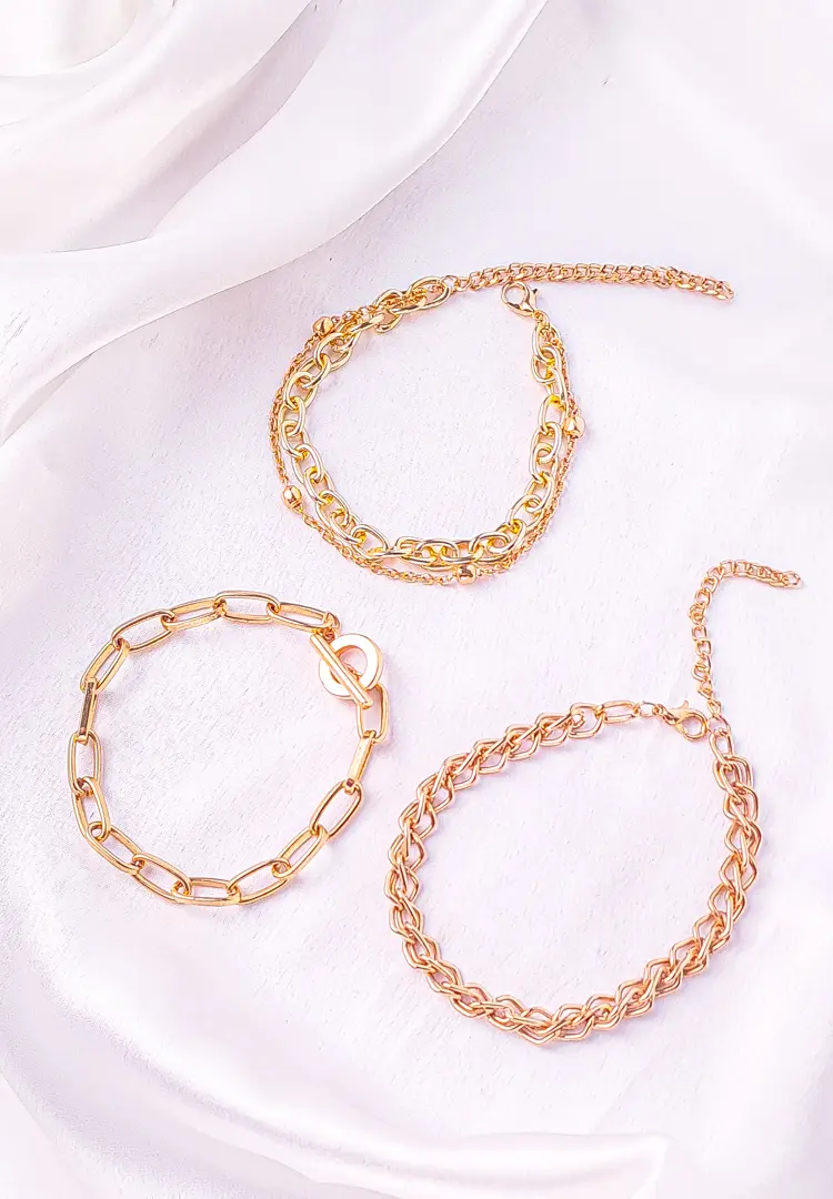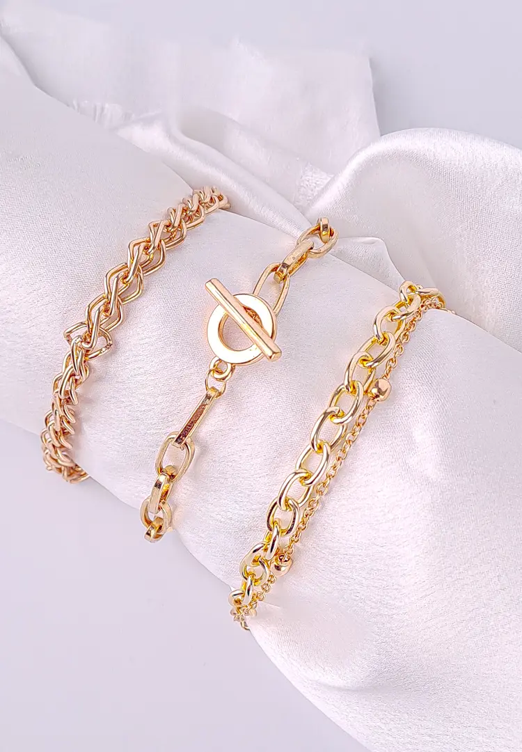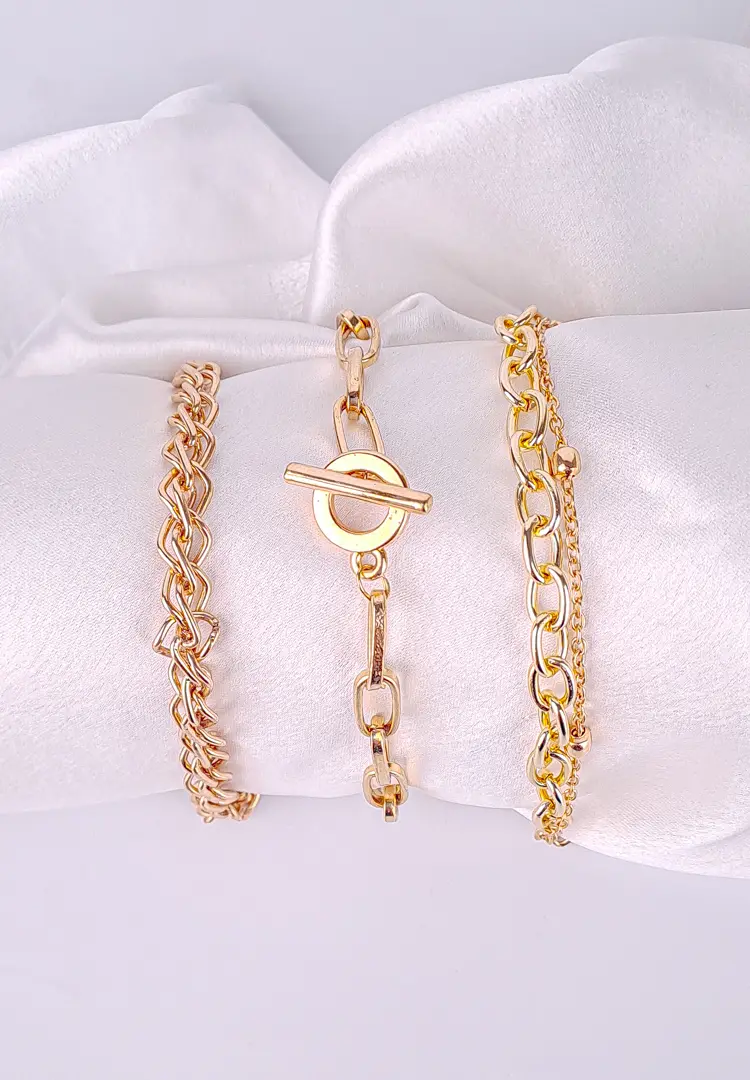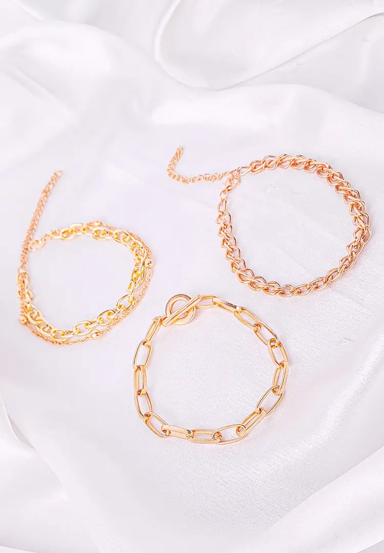 Pack of three gold-tone chain bracelets in varied link styles. Elongated, twisted rope, and double-layered oval links. Each piece features a polished finish that catches the light, with secure lobster and toggle clasp closures. Versatile for stacking or solo wear, the set offers a modern, statement look.
