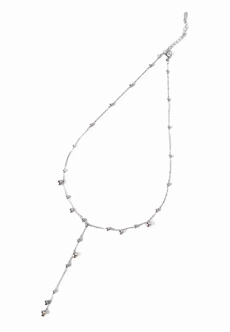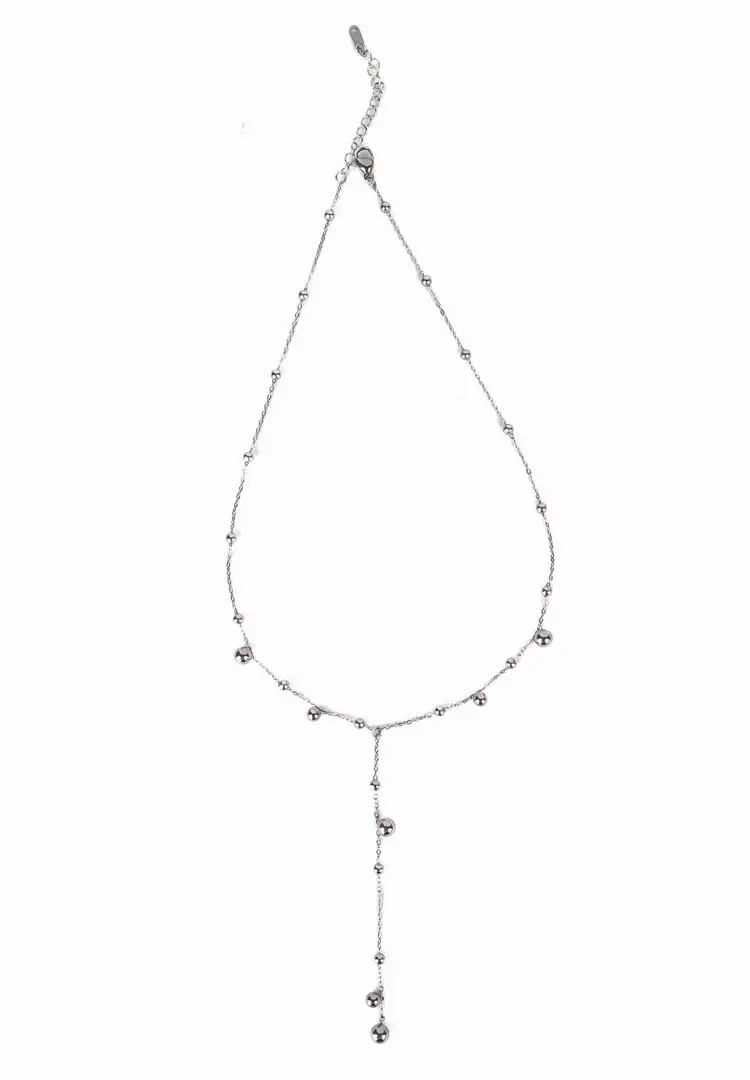 Sleek stainless steel Y-shaped lariat necklace with glossy round bead accents and a cascading drop. Polished finish with a delicate chain and adjustable lobster clasp for versatile, modern styling.