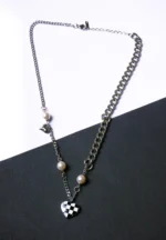Asymmetrical metal curb chain necklace with polished silver-tone finish featuring black and white checkered heart shaped pendant adorned with circular pearls and a heart shaped charms with lobster claw clasp
