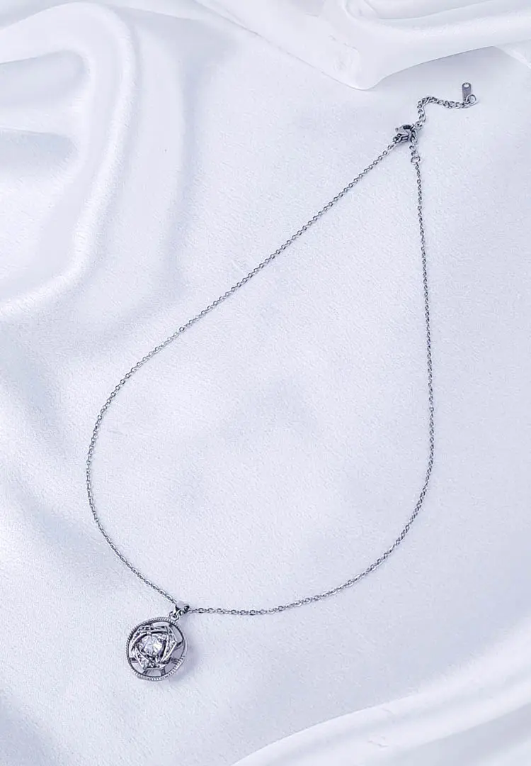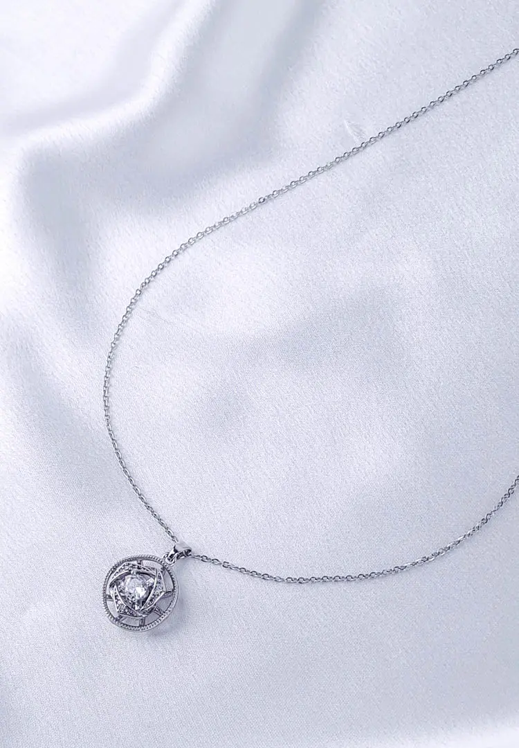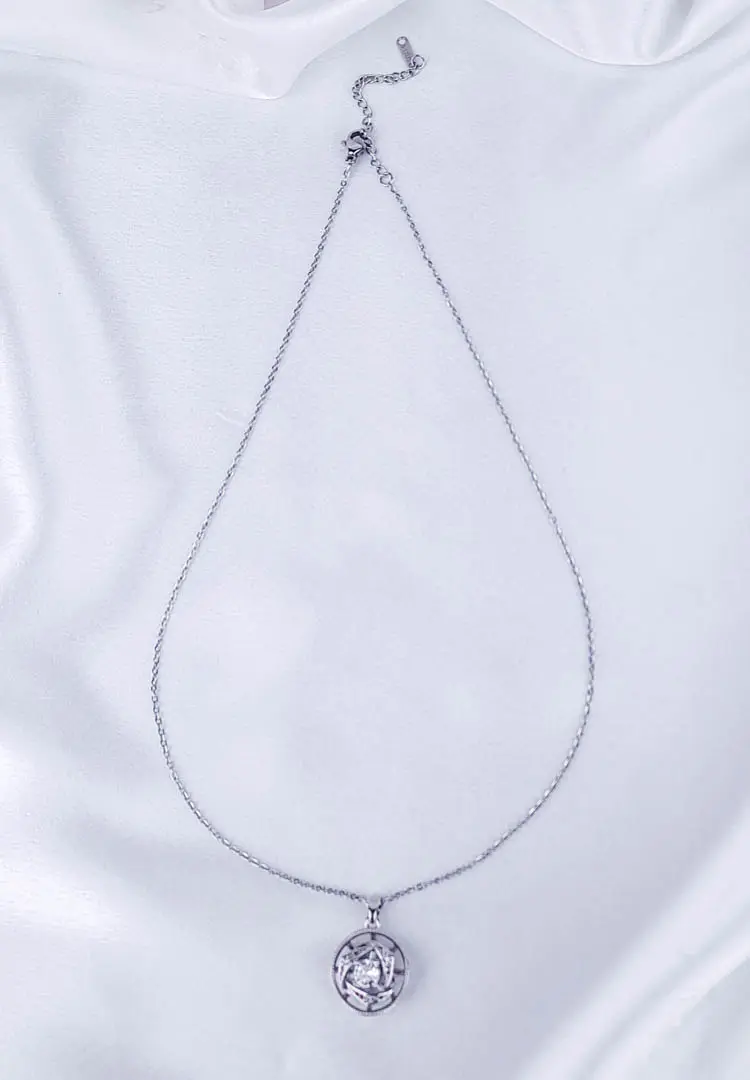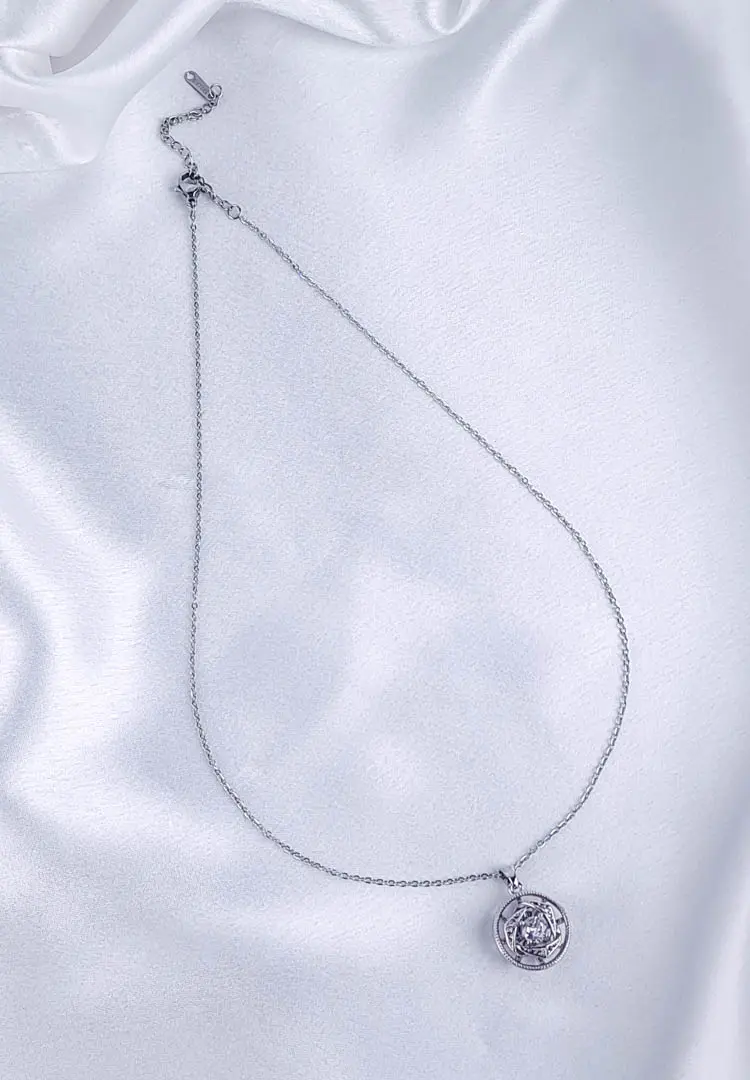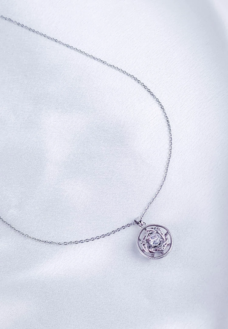 Silver tone metal curb chain necklace adorned with spinning flower shaped pandent with a clear stone placed in the centre and a lobster claw clasp