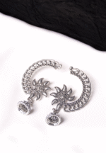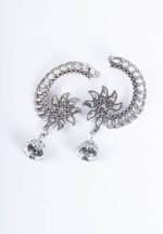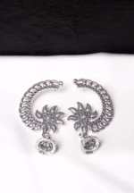 Oxidised silver toned crescent shaped jhumka drop earring with fine intricate floral detailing and a push back post