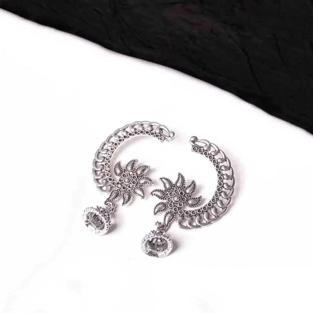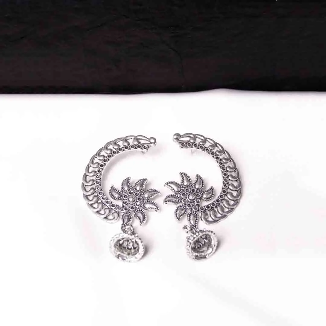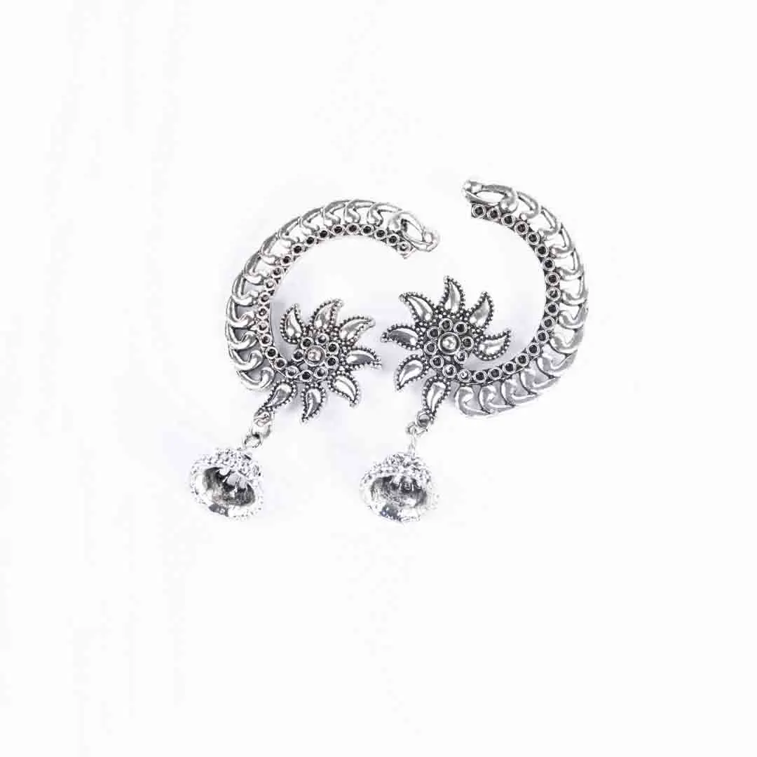 Oxidised silver toned crescent shaped jhumka drop earring with fine intricate floral detailing and a push back post