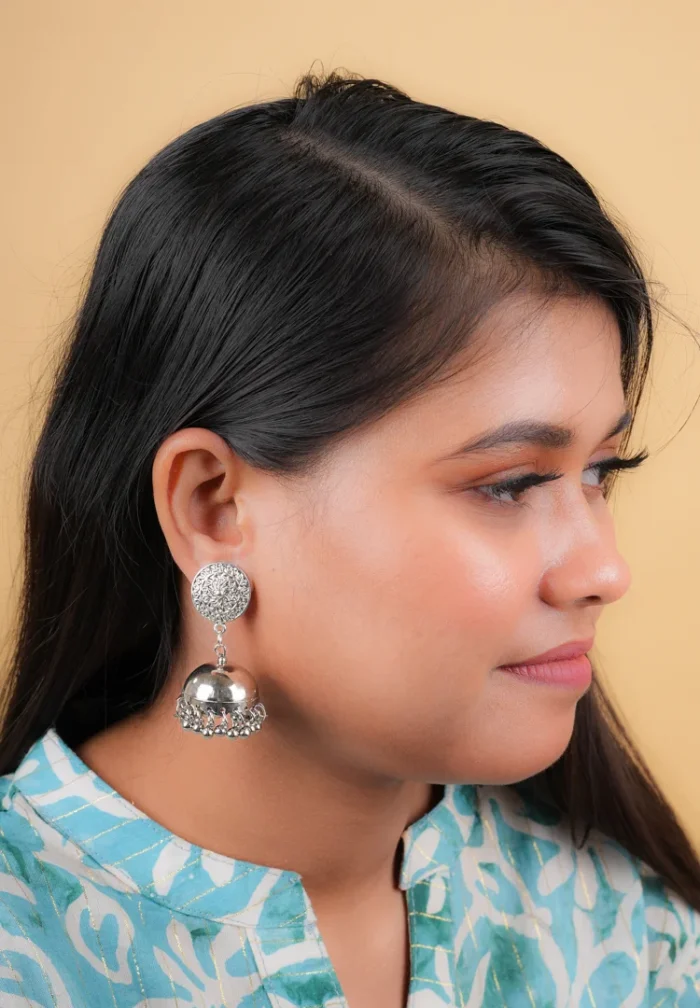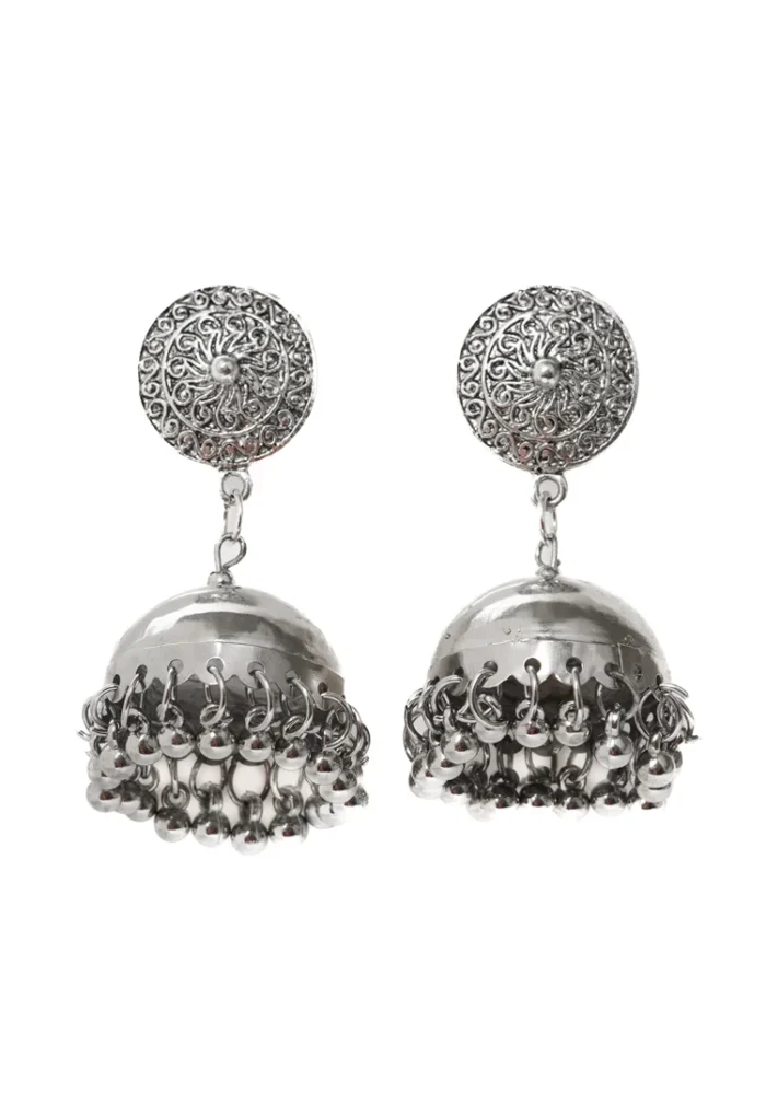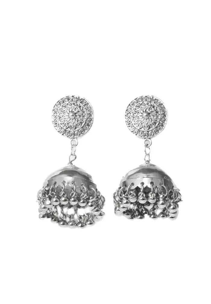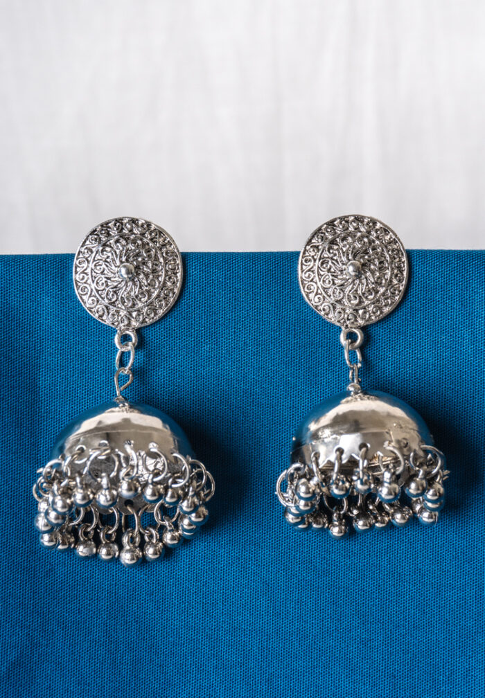 Metal drop earring with oxidised silver-tone finish featuring featuring a circular top with intricate floral detailing attached with a jhumka adorned with ghungroos at the bottom and push back closure