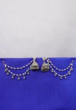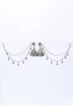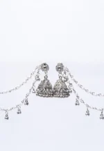 Metal jhumka ear hair chain earring with fine intricate detailing and silver tone finish featuring a detailed circular top and triangular jhumkas with a push back closure and fine chain tassels adorned with evenly spaced pearl beads and ghungroos with a french hook closure