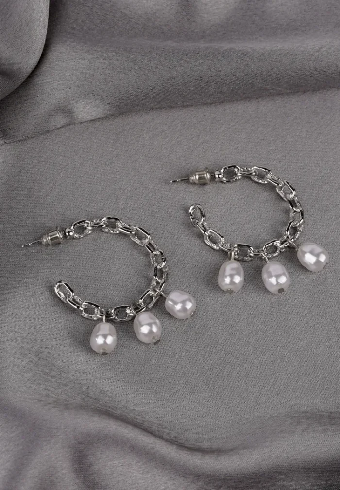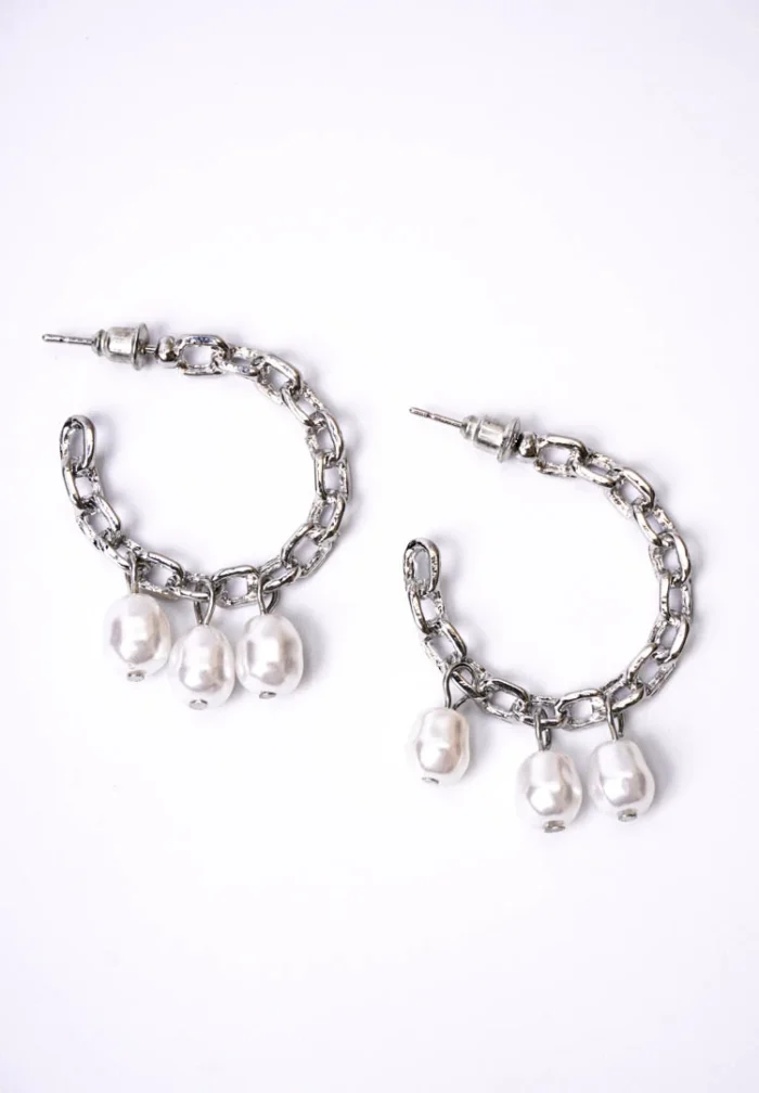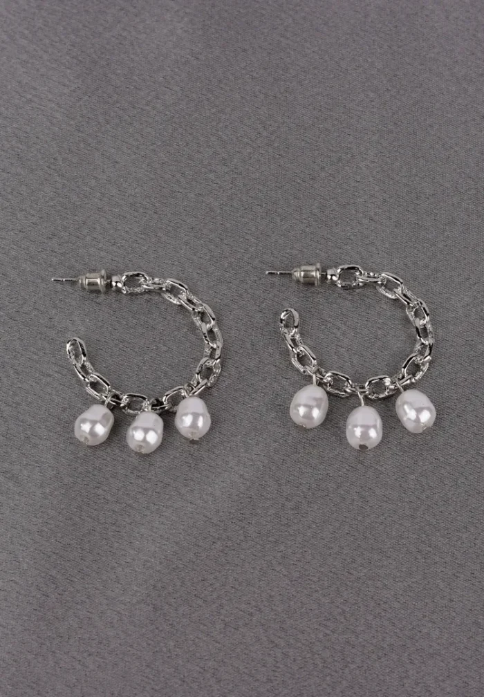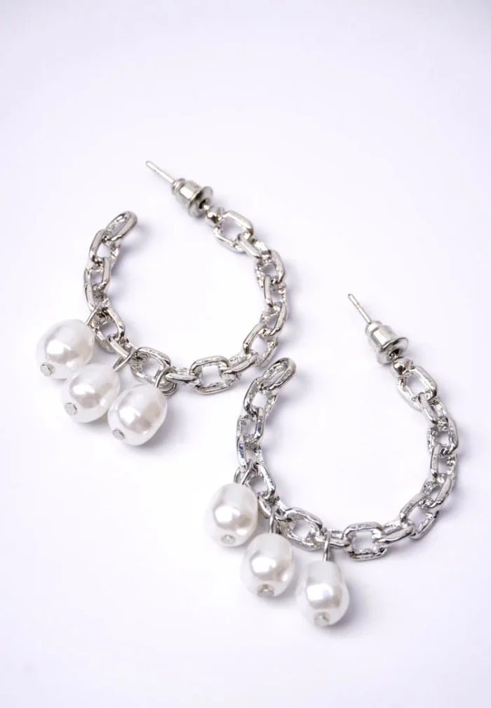 Chain-like patterned metal c hoop earring with silver tone/pearl white finish featuring three slinging perals at the curve with a push back post