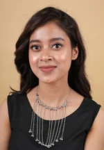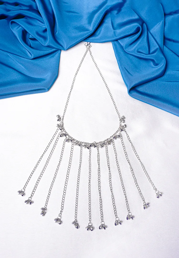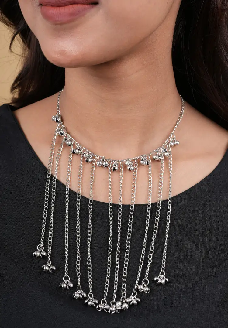 Metal curb chain necklace featuring chain tassels of varying lengths adorned with ghungroos and a s hook closure