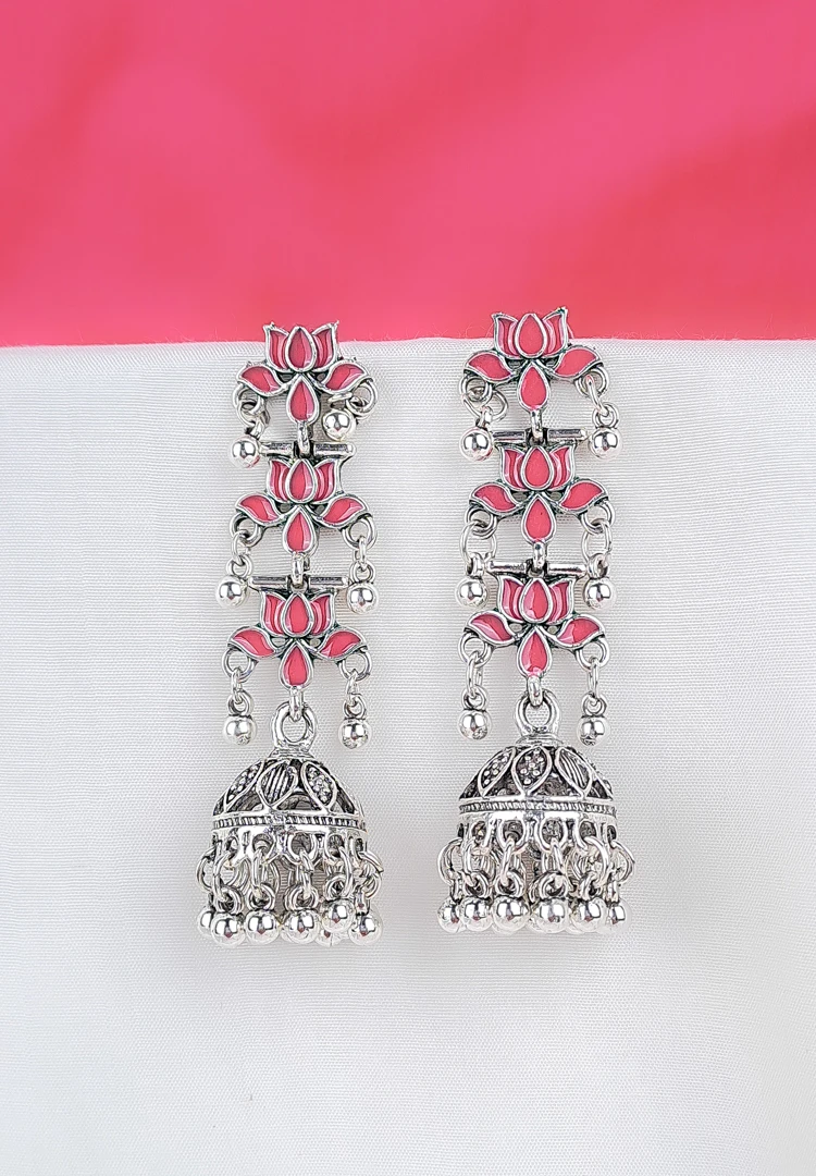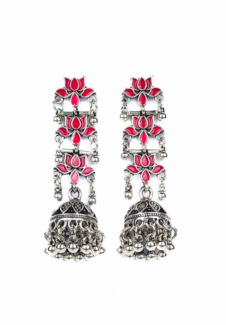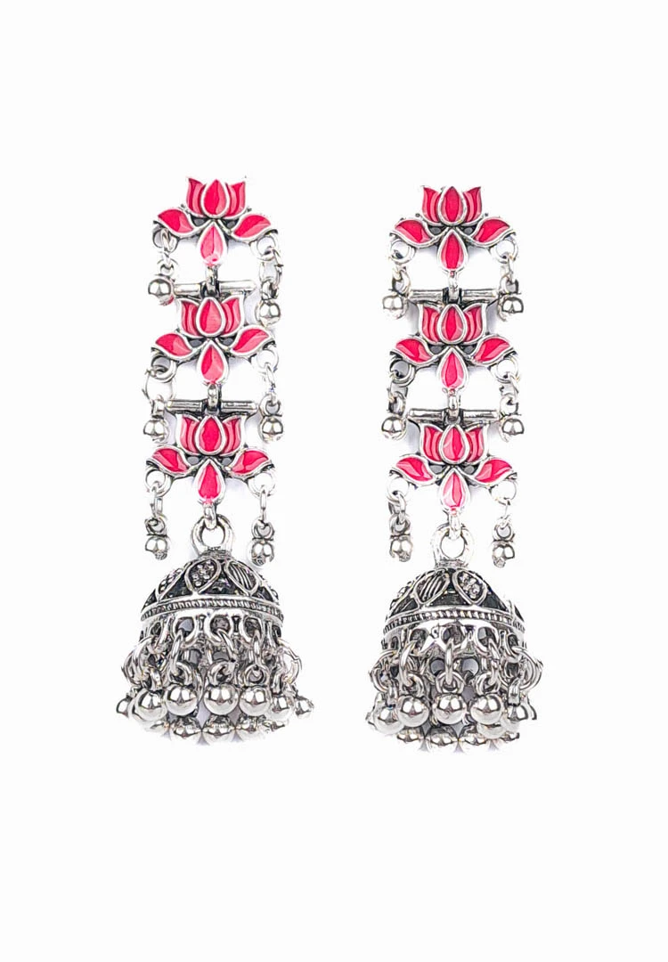 Our Tiered Floral Link Jhumka is a beautifully structured take on the classic Indian bell earring. The journey begins with a vibrant top stud featuring a dark pink enameled lotus, which then gracefully descends through two more linked floral tiers. This stacked arrangement creates a stunning, linear cascade of color and texture. The piece culminates in a traditional oxidized silver Jhumka (bell) that features intricate etching and is finished with tiny dangling beads. The oxidized silver finish contrasts beautifully with the pop of pink enamel, giving the earring a rich, antique look that is both striking and comfortable to wear. This is the perfect statement piece for anyone who loves structured elegance with a vibrant, ethnic flair.