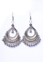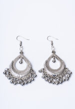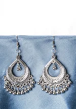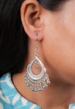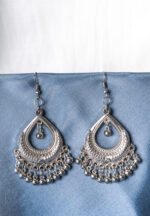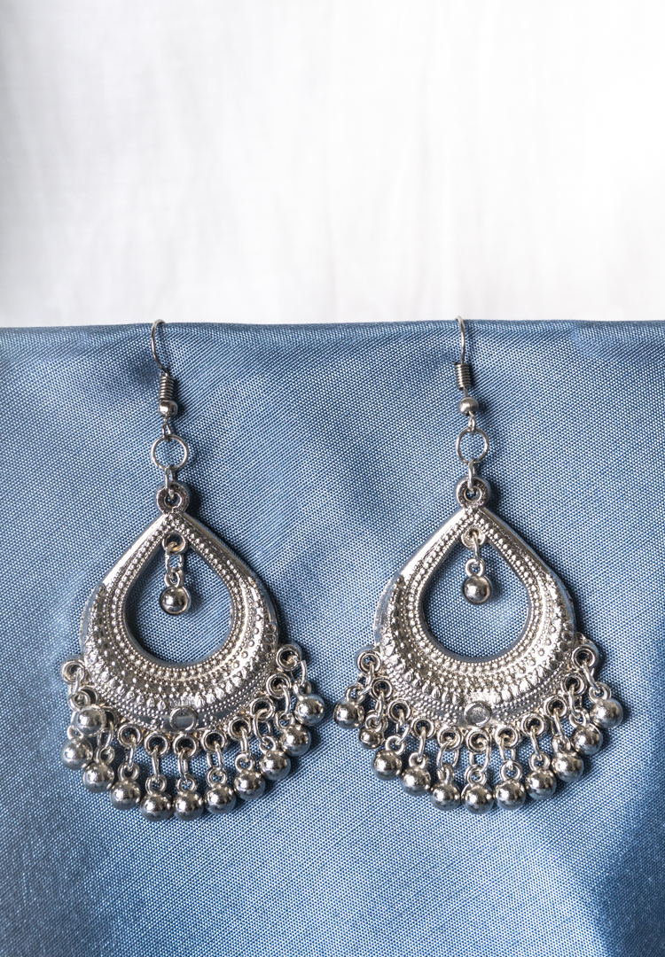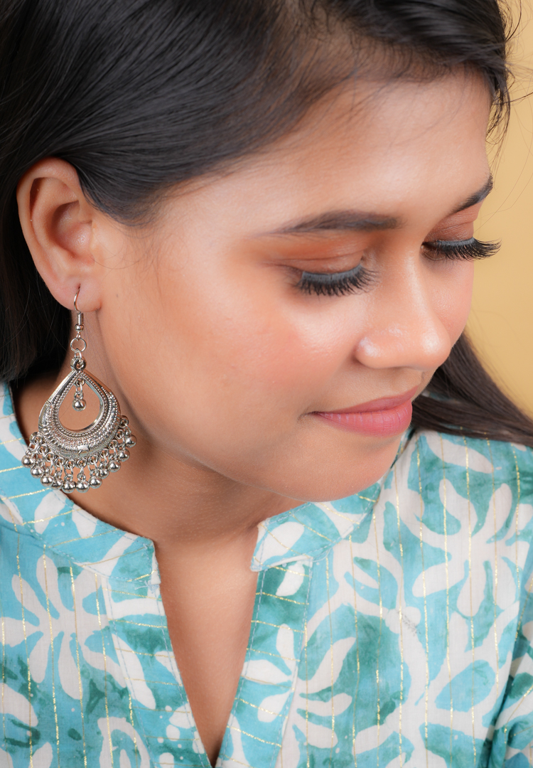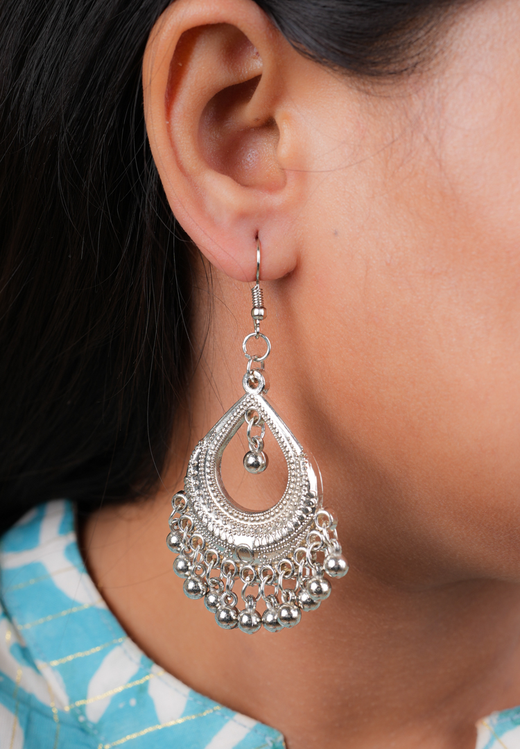 Tear drop shaped dangle earring with fine detailing and silver-tone finish adorned with ghungroos at the curve with a french hook
