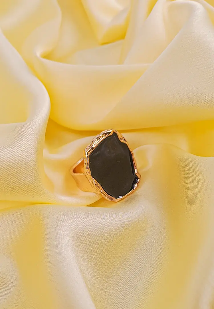 Contemporary ring showcasing a bold, irregularly shaped black stone set in a textured metallic bezel, finished with a smooth band for a striking modern touch.